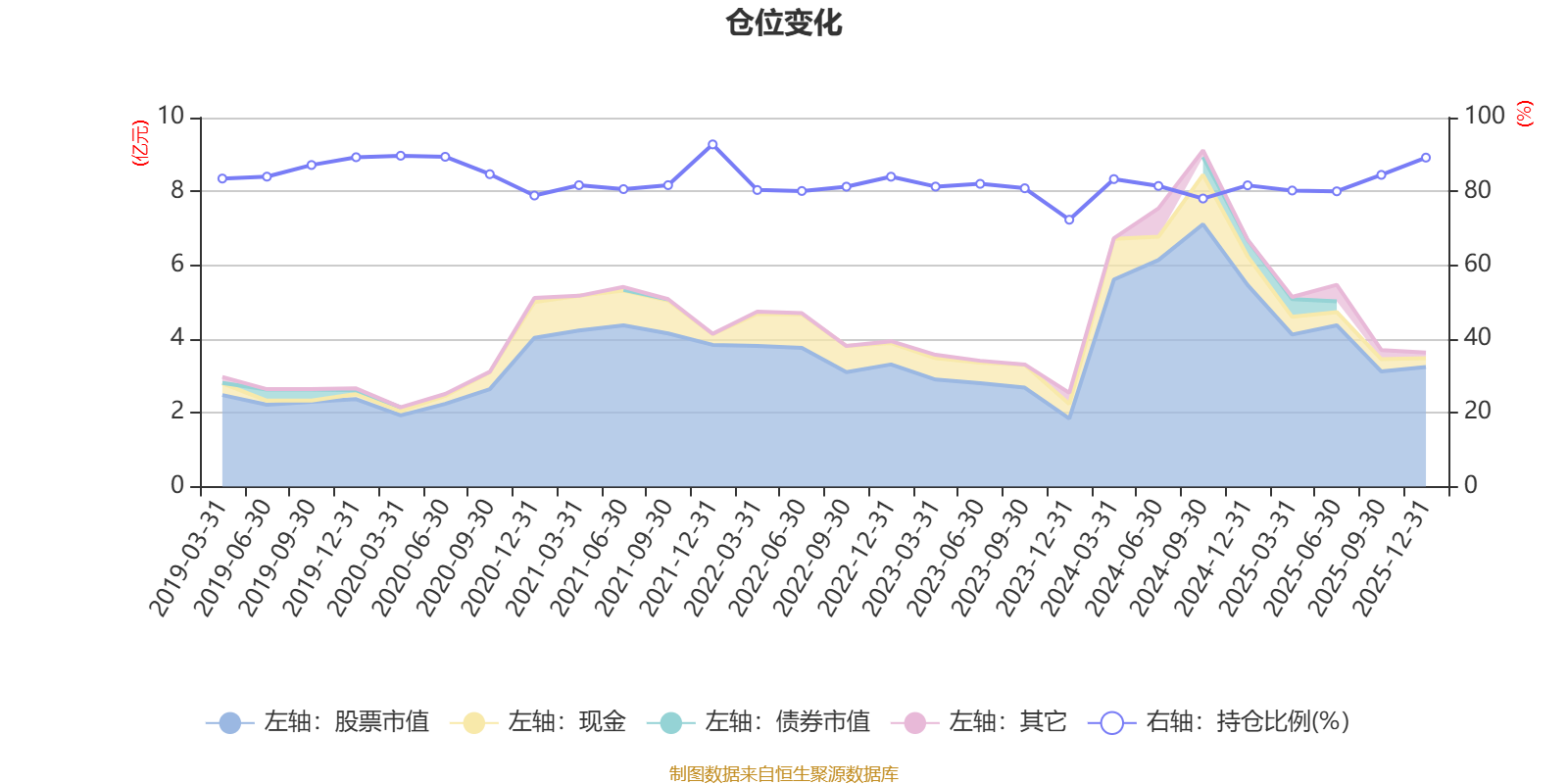 据定期报告数据统计,近三年平均股票仓位为81.24%,同类平均为89.51%。2021年末基金达到92.74%的最高仓位,2023年末最低,为72.32%。