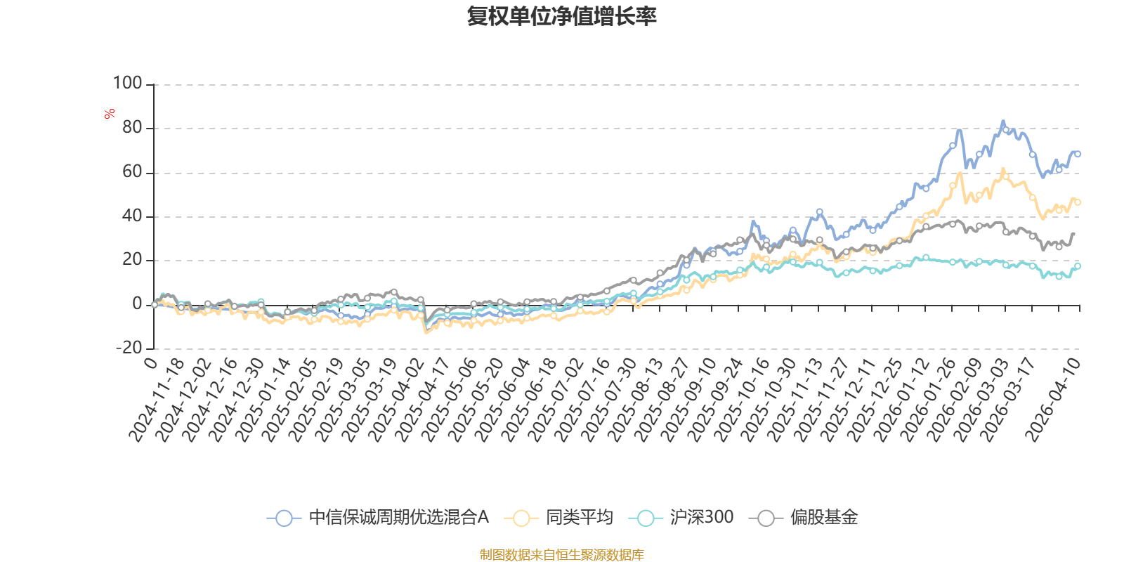 截至4月10日,中信保诚周期优选混合A近三个月复权单位净值增长率为9.37%,位于同类可比基金15/49;近半年复权单位净值增长率为24.02%,位于同类可比基金16/49;近一年复权单位净值增长率为84.01%,位于同类可比基金18/48。