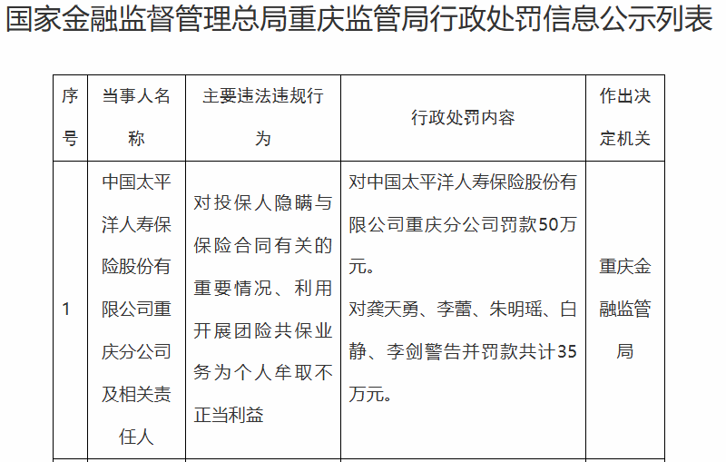 太平洋寿险被罚50万元,多名责任人遭警告并罚款