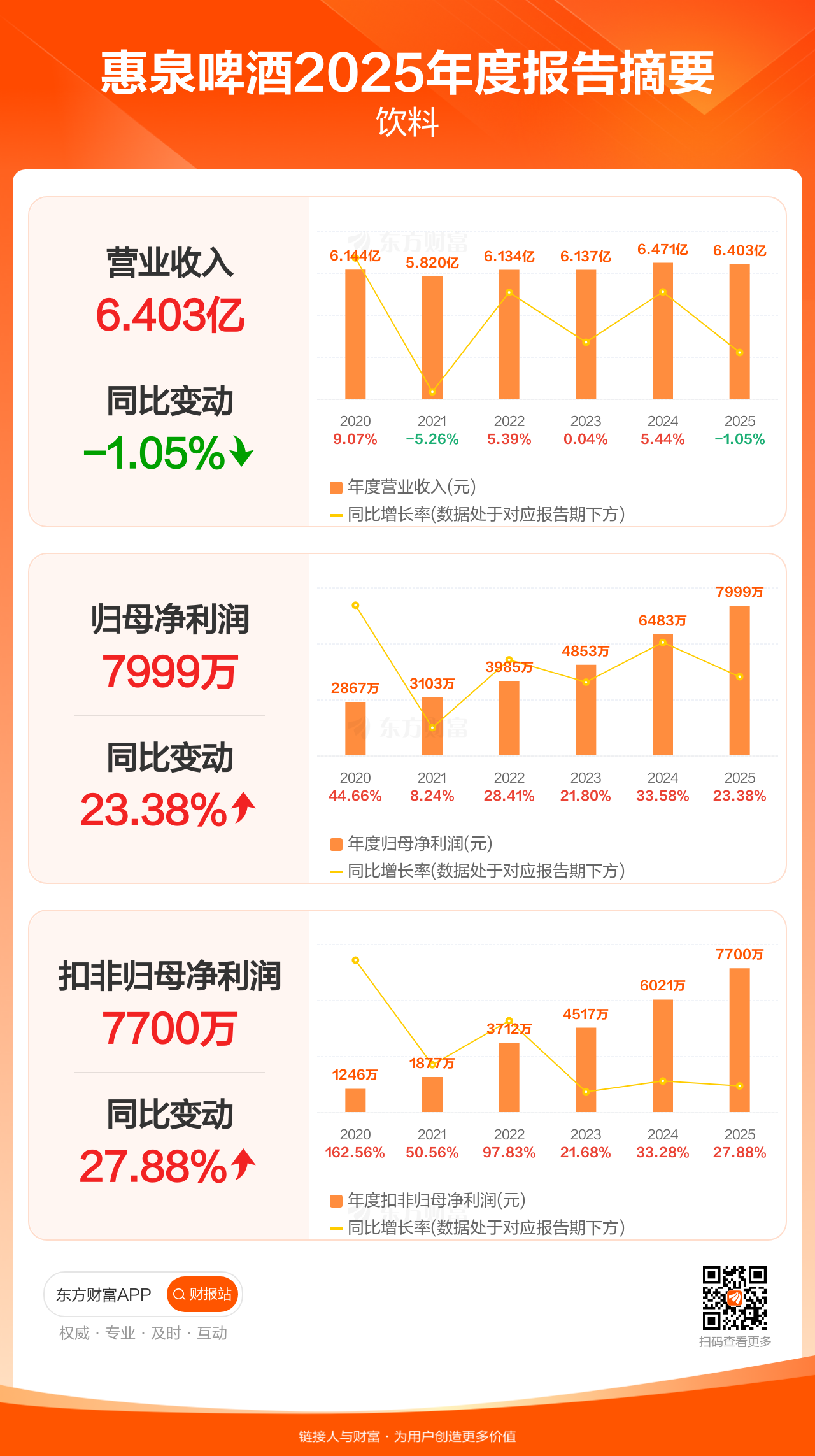 惠泉啤酒4月13日发布2025年年报显示,公司全年实现营业收入6.40亿元,同比下滑1.05%;归母净利润7999.05万元,同比增长23.38%;扣非归母净利润7699.55万元,同比增长27.88%。