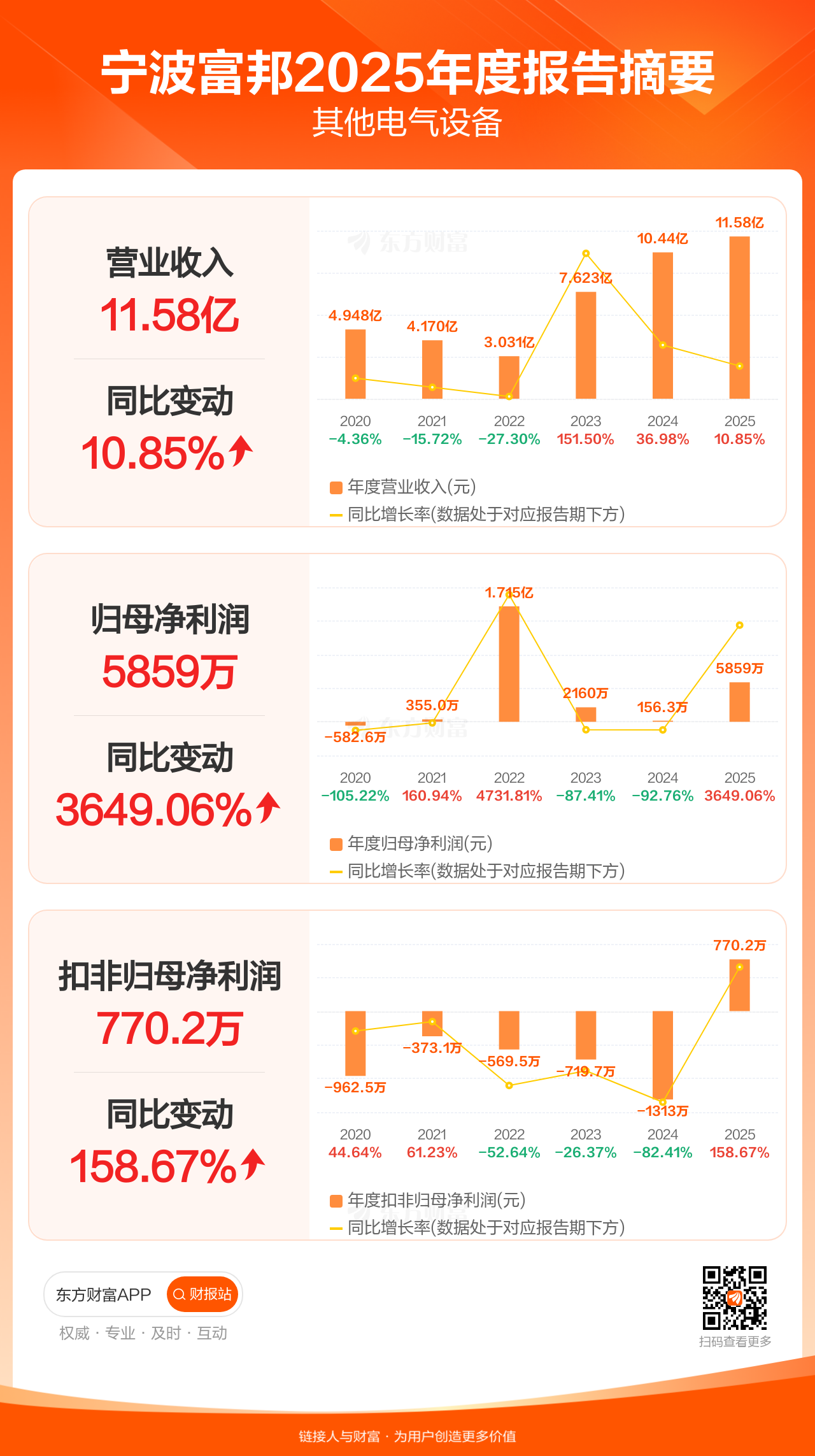 宁波富邦4月13日发布2025年年报显示,公司全年实现营业收入11.58亿元,同比增长10.85%;归母净利润5858.68万元,同比增长3649.06%;扣非归母净利润770.23万元,同比增长158.67%。