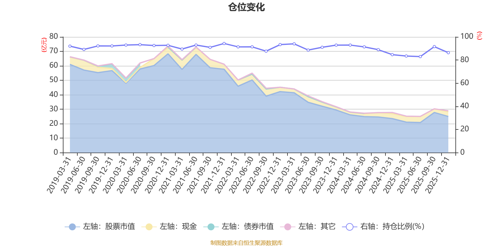 据定期报告数据统计,近三年平均股票仓位为89.08%,同类平均为86.17%。2021年末基金达到94.31%的最高仓位,2025年上半年末最低,为82.98%。