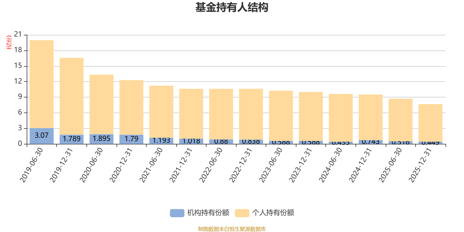 截至2025年12月31日,基金持有人共计62.18万户,合计持有7.67亿份。其中管理人员工持有34.34万份,占比0.04%,机构持有份额占比5.86%,个人投资者占比94.14%。