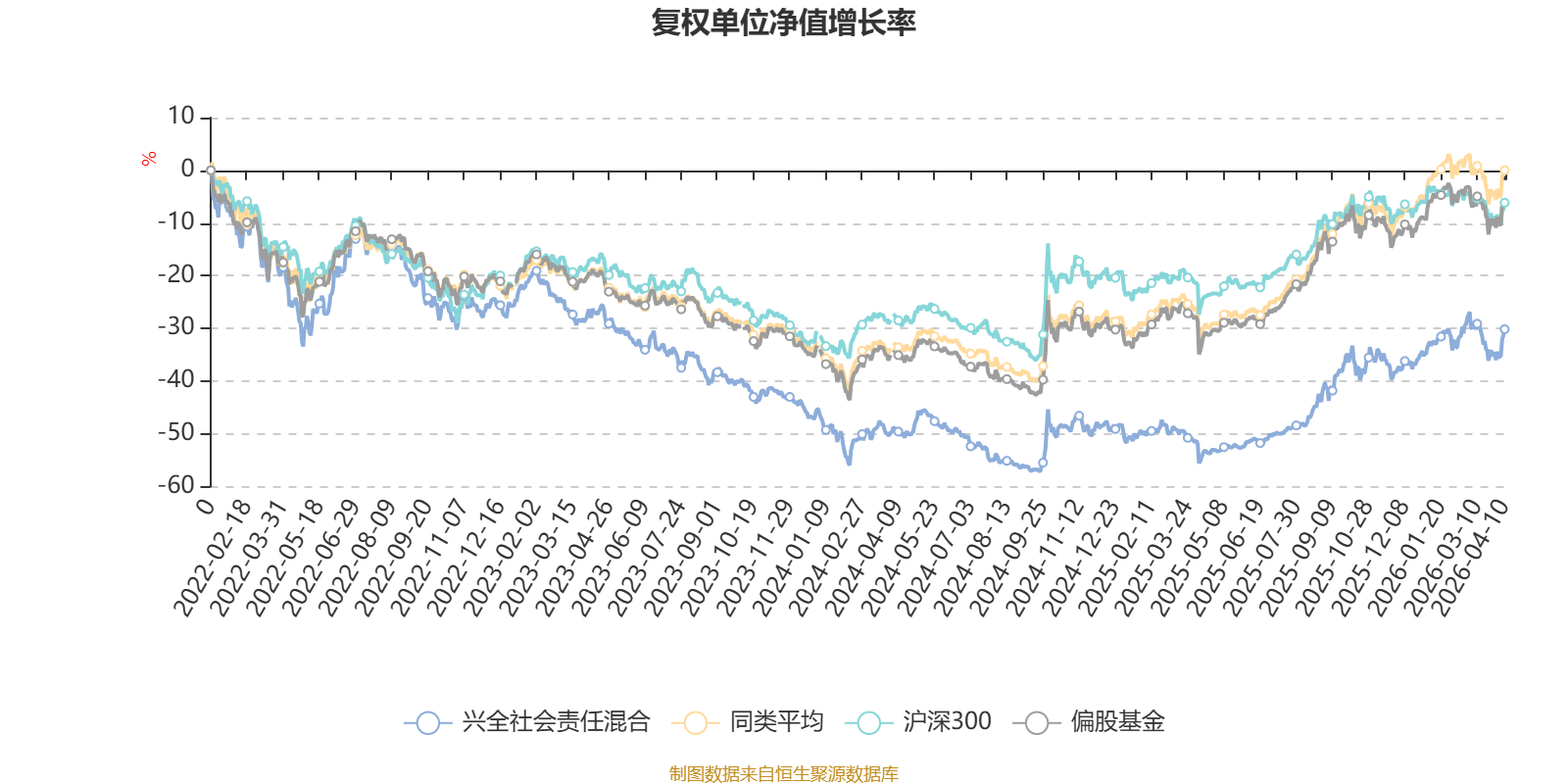 截至4月10日,兴全社会责任混合近三个月复权单位净值增长率为3.79%,位于同类可比基金31/130;近半年复权单位净值增长率为9.10%,位于同类可比基金39/130;近一年复权单位净值增长率为51.36%,位于同类可比基金39/130;近三年复权单位净值增长率为-4.34%,位于同类可比基金111/126。