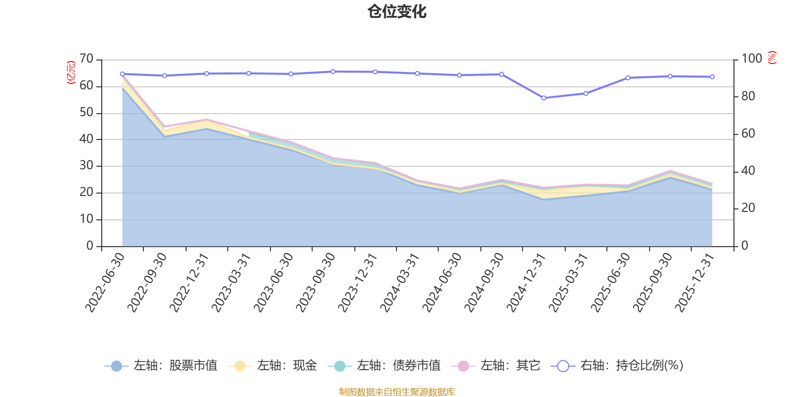据定期报告数据统计,近三年平均股票仓位为90.13%,同类平均为86.17%。2023年三季度末基金达到93.57%的最高仓位,2024年末最低,为79.45%。