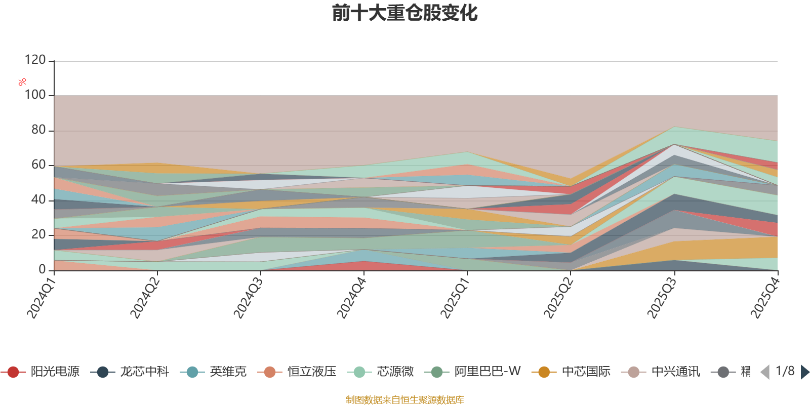 该基金持股集中度较高。截至2025年末,基金十大重仓股分别是海光信息、中芯国际、寒武纪、华丰科技、芯源微、青鸟消防、奕瑞科技、芯原股份、华鲁恒升、龙佰集团。