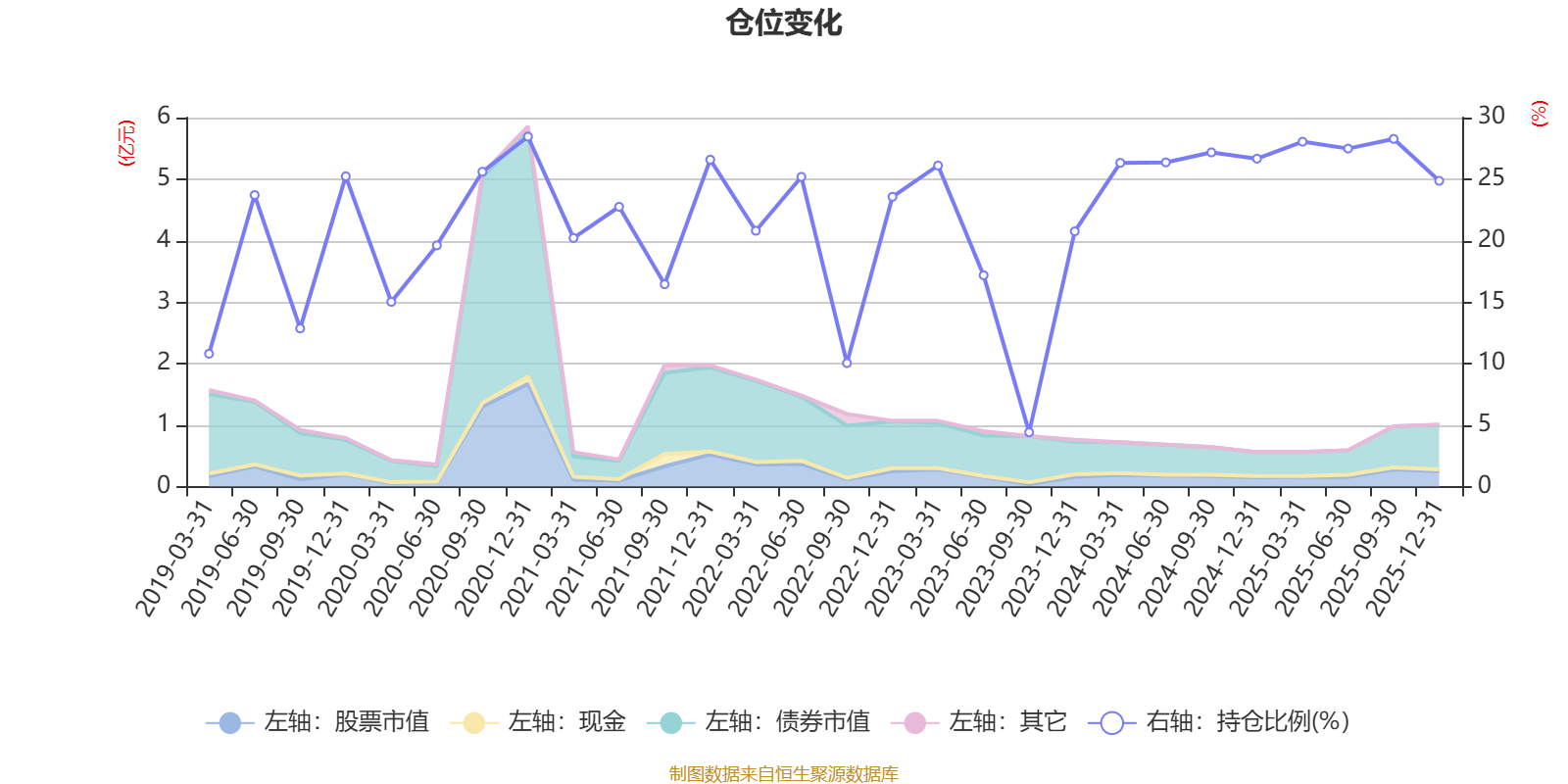 据定期报告数据统计,近三年平均股票仓位为23.63%,同类平均为19.2%。2020年末基金达到28.45%的最高仓位,2023年三季度末最低,为4.41%。