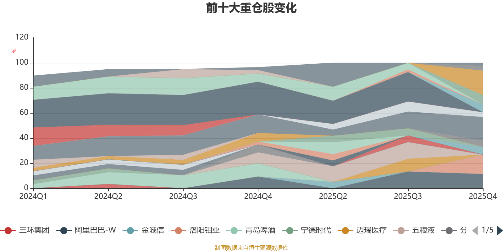 该基金持股集中度较高。截至2025年末,基金十大重仓股分别是紫金矿业、腾讯控股、洛阳钼业、阿里巴巴-W、鼎龙股份、雅克科技、川投能源、中国电信、伟明环保、美的集团。