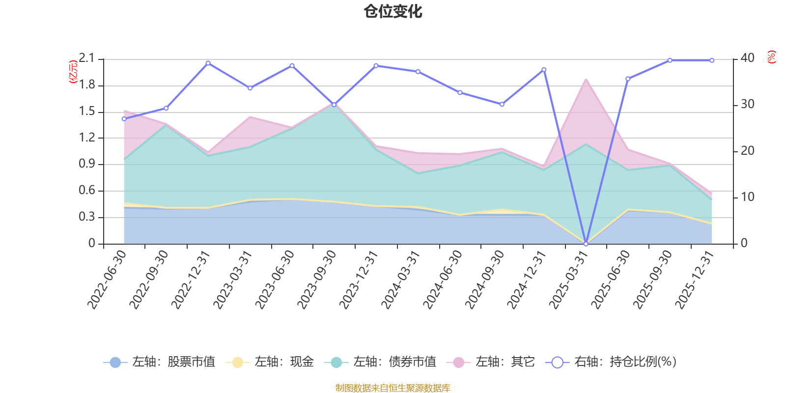 据定期报告数据统计,近三年平均股票仓位为32.82%,同类平均为19.2%。2025年三季度末基金达到39.7%的最高仓位,2022年上半年末最低,为27.05%。