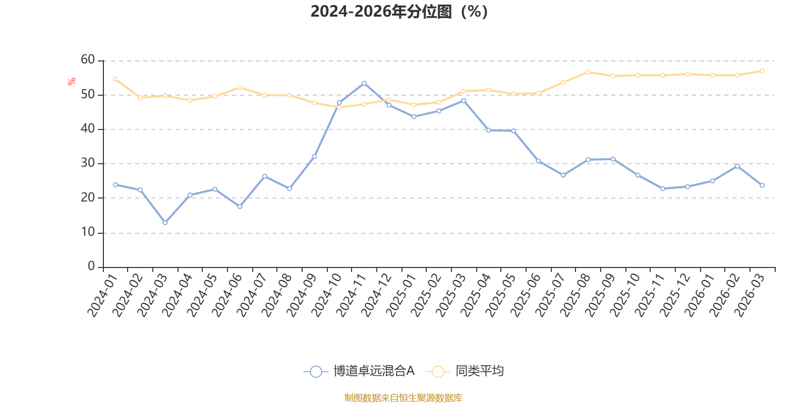 通过所选区间该基金净值增长率分位图,可以观察该基金与同类基金业绩比较情况。图为坐标原点到区间内某时点的净值增长率在同类基金中的分位数。