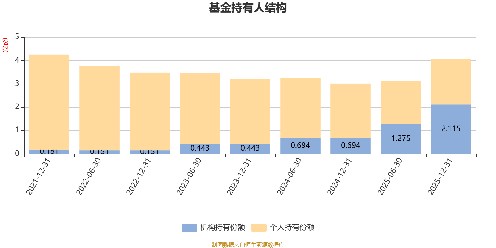 截至2025年12月31日,基金持有人共计2.69万户,合计持有4.07亿份。其中管理人员工持有570.38万份,占比1.40%,机构持有份额占比52.01%,个人投资者占比47.99%。