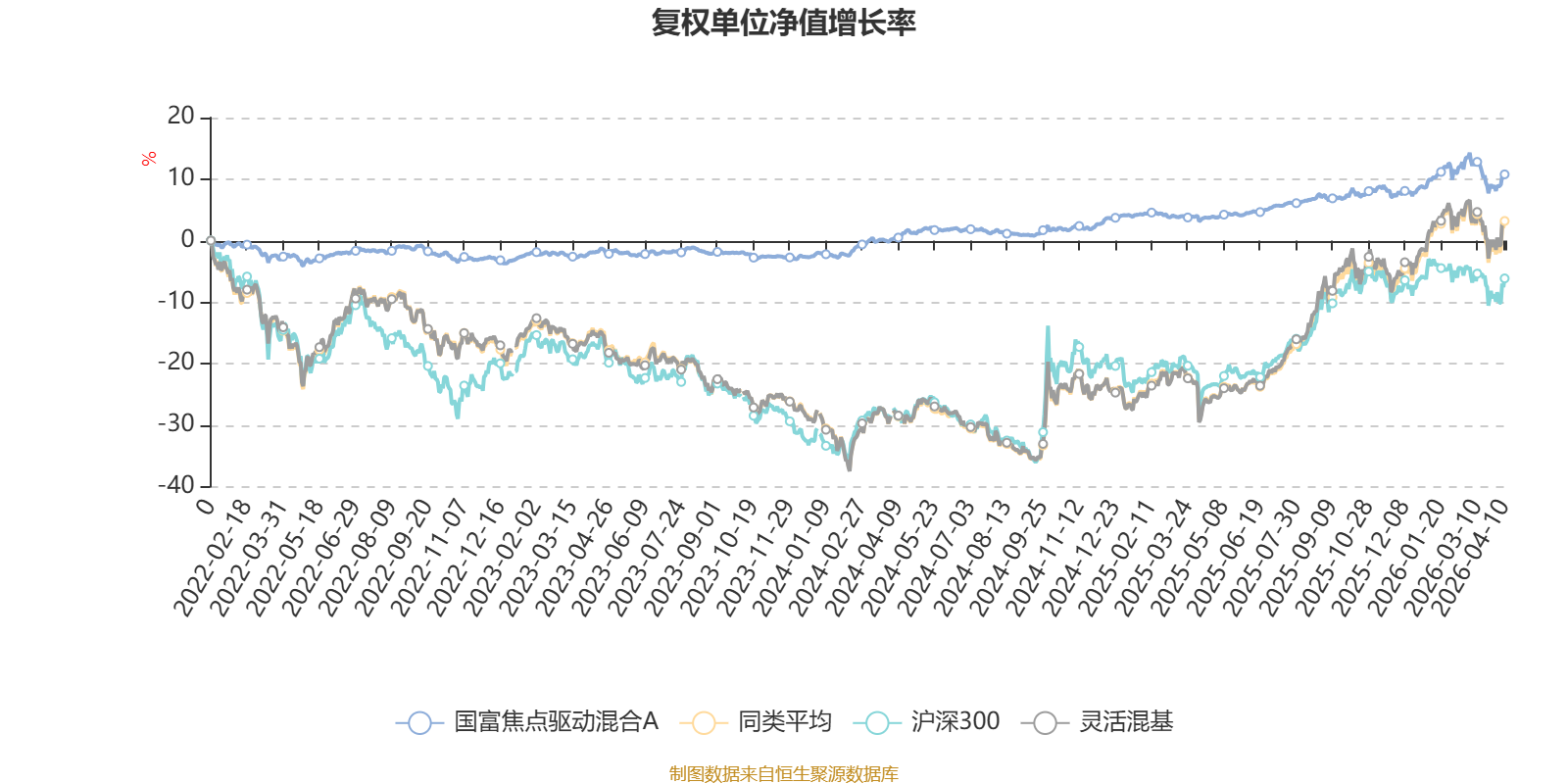 截至4月10日,国富焦点驱动混合A近三个月复权单位净值增长率为0.60%,位于同类可比基金579/1287;近半年复权单位净值增长率为2.60%,位于同类可比基金738/1286;近一年复权单位净值增长率为6.88%,位于同类可比基金1101/1286;近三年复权单位净值增长率为12.96%,位于同类可比基金690/1286。
