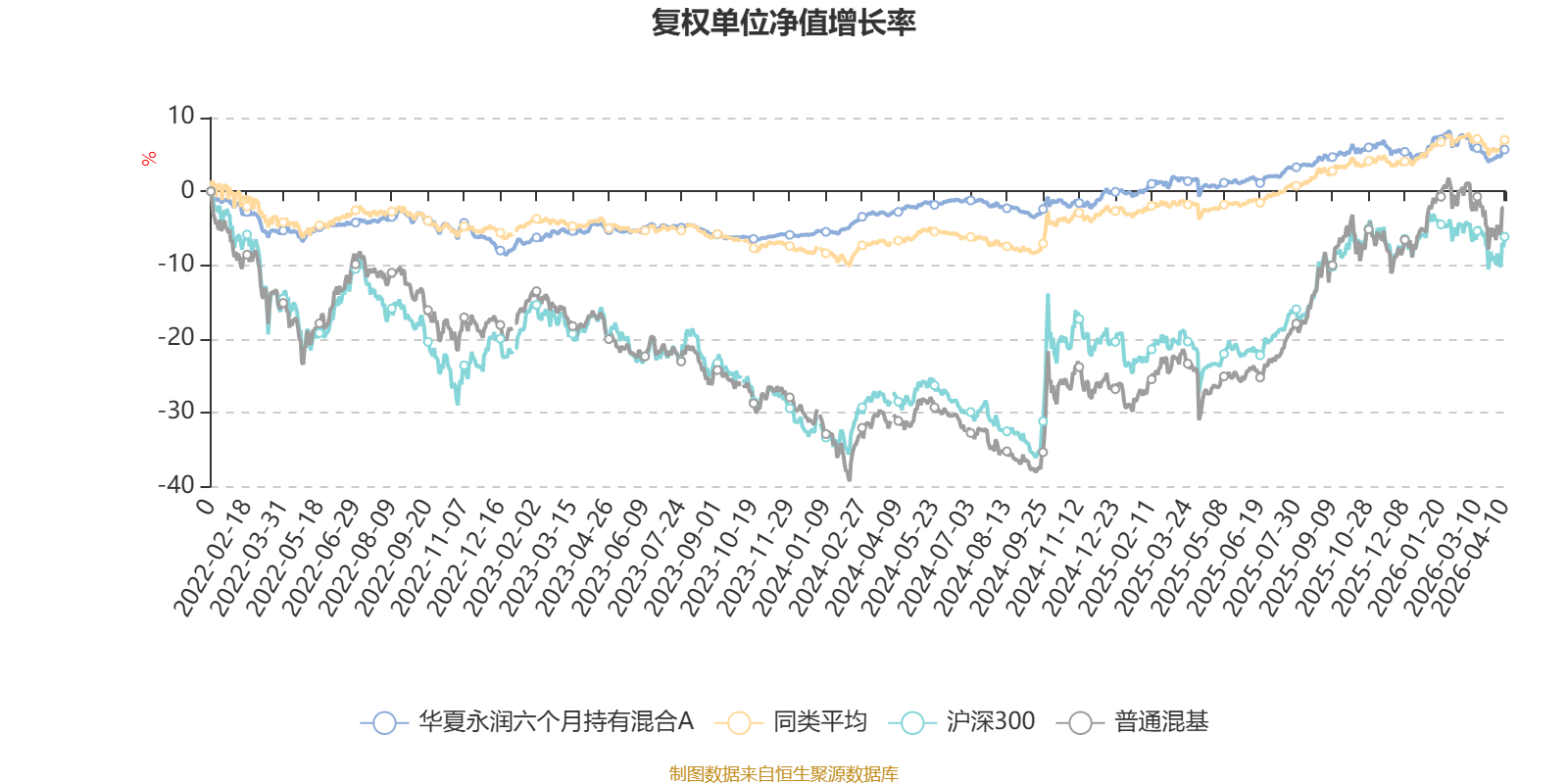截至4月10日,华夏永润六个月持有混合A近三个月复权单位净值增长率为-0.84%,位于同类可比基金516/629;近半年复权单位净值增长率为-0.19%,位于同类可比基金520/629;近一年复权单位净值增长率为5.03%,位于同类可比基金450/629;近三年复权单位净值增长率为10.55%,位于同类可比基金308/581。