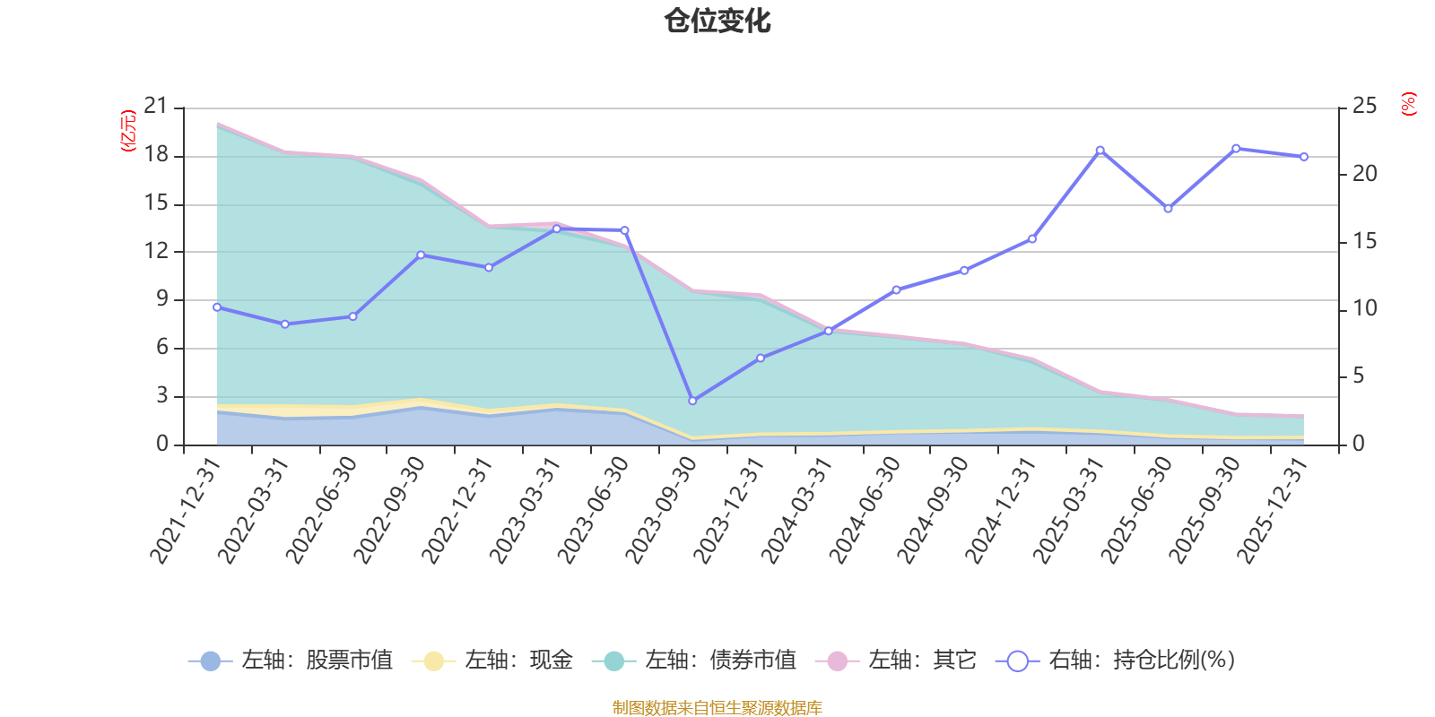 据定期报告数据统计,近三年平均股票仓位为14.37%,同类平均为19.2%。2025年三季度末基金达到21.97%的最高仓位,2023年三季度末最低,为3.27%。