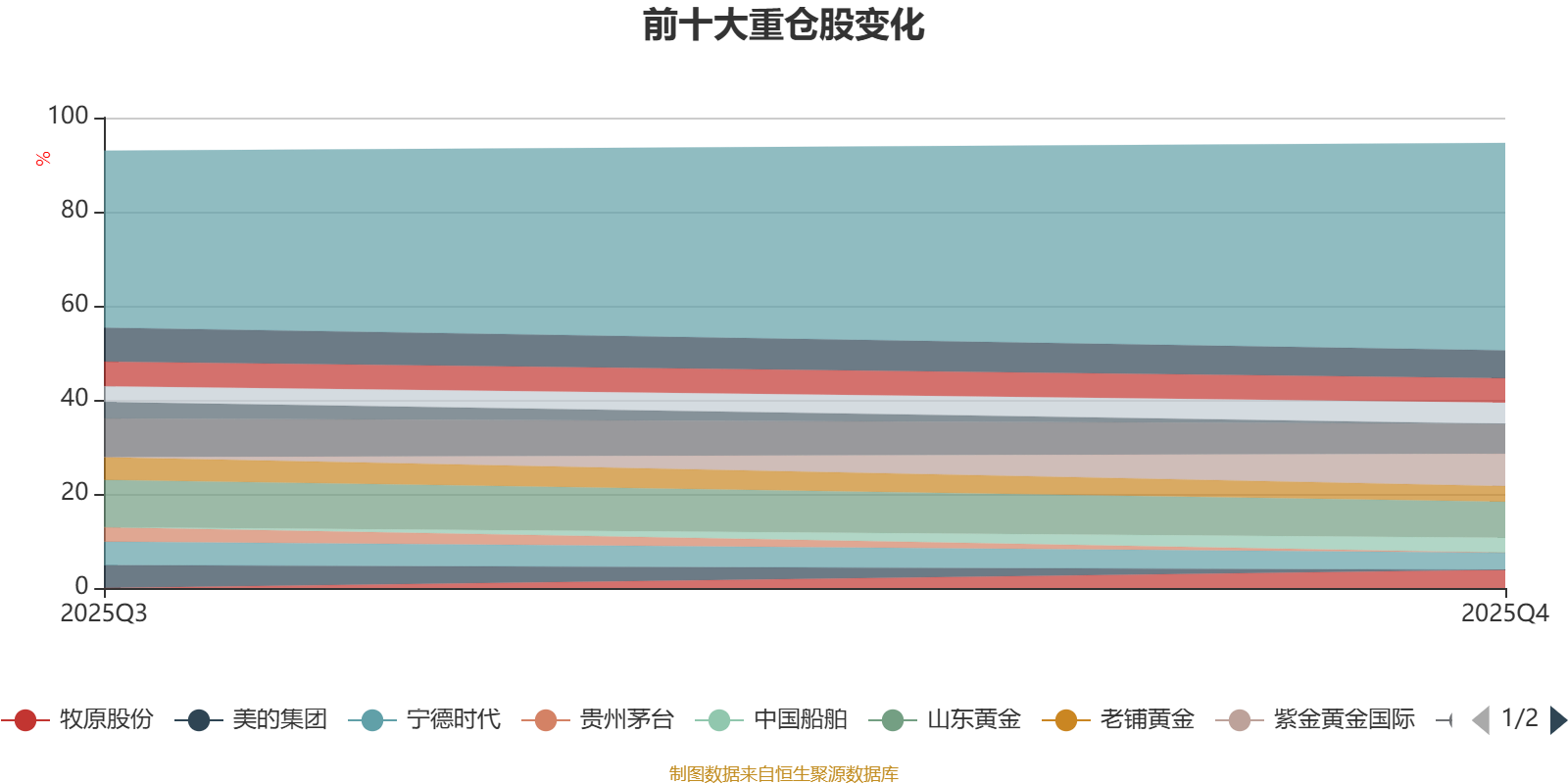 该基金持股集中度较高。截至2025年末,基金十大重仓股分别是山东黄金、紫金黄金国际、赤峰黄金、腾讯控股、中国平安、阿里巴巴-W、牧原股份、宁德时代、老铺黄金、中国船舶。