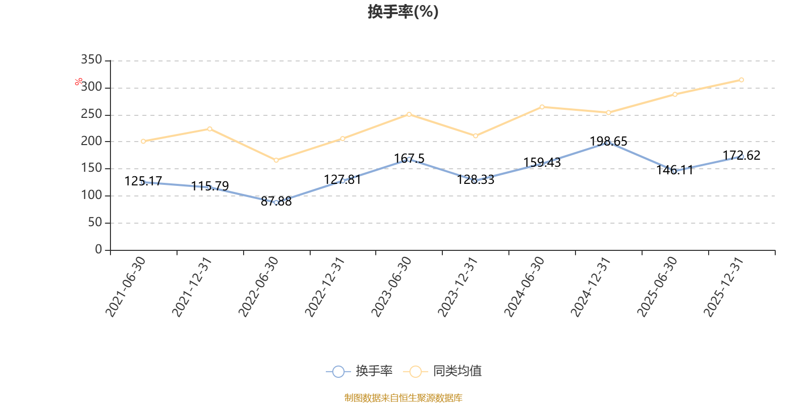 截至2025年12月31日,基金最近一年换手率约316.53%,持续低于同类均值。