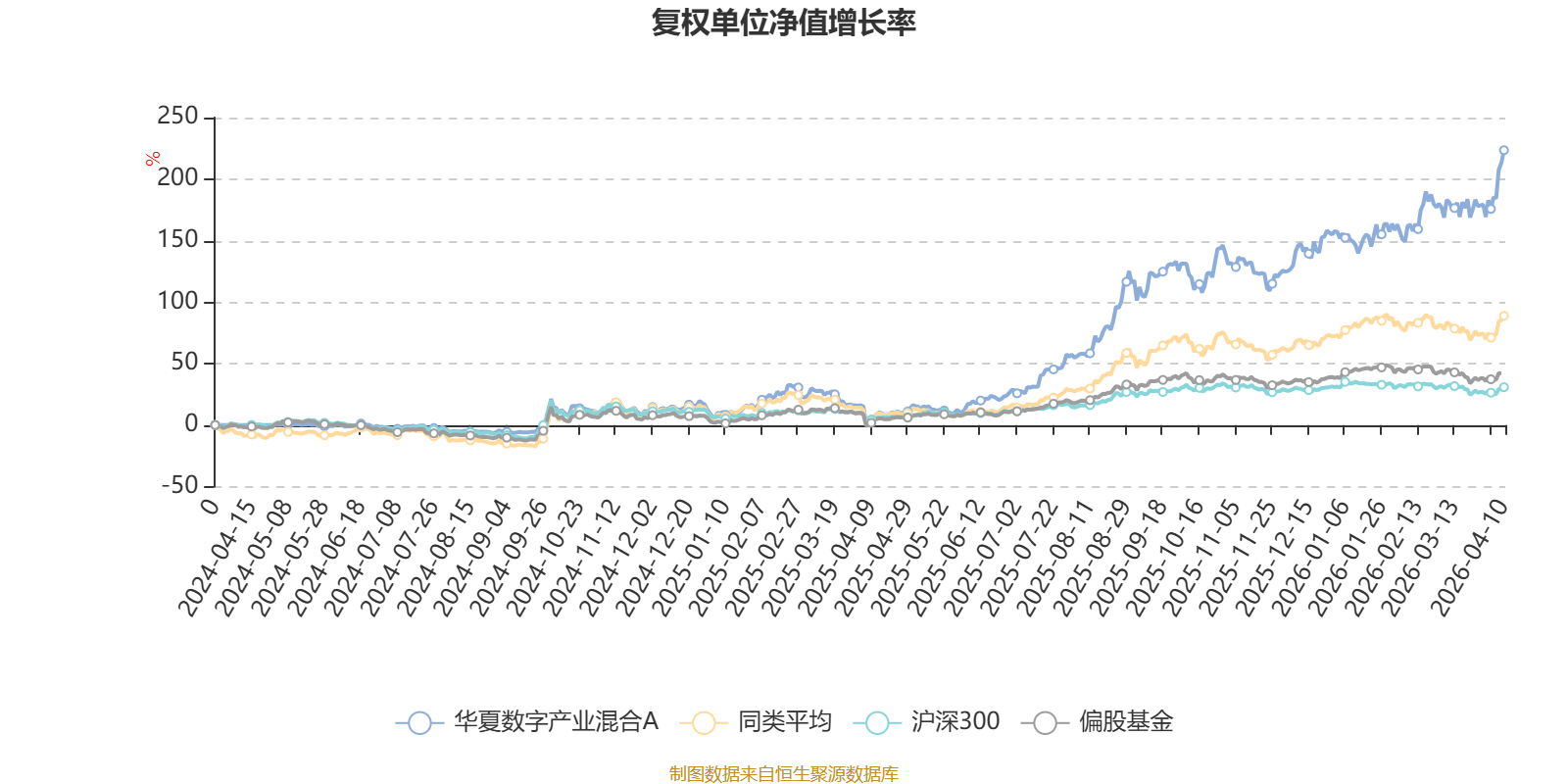 截至4月10日,华夏数字产业混合A近三个月复权单位净值增长率为29.79%,位于同类可比基金2/229;近半年复权单位净值增长率为45.43%,位于同类可比基金7/229;近一年复权单位净值增长率为204.26%,位于同类可比基金7/229。