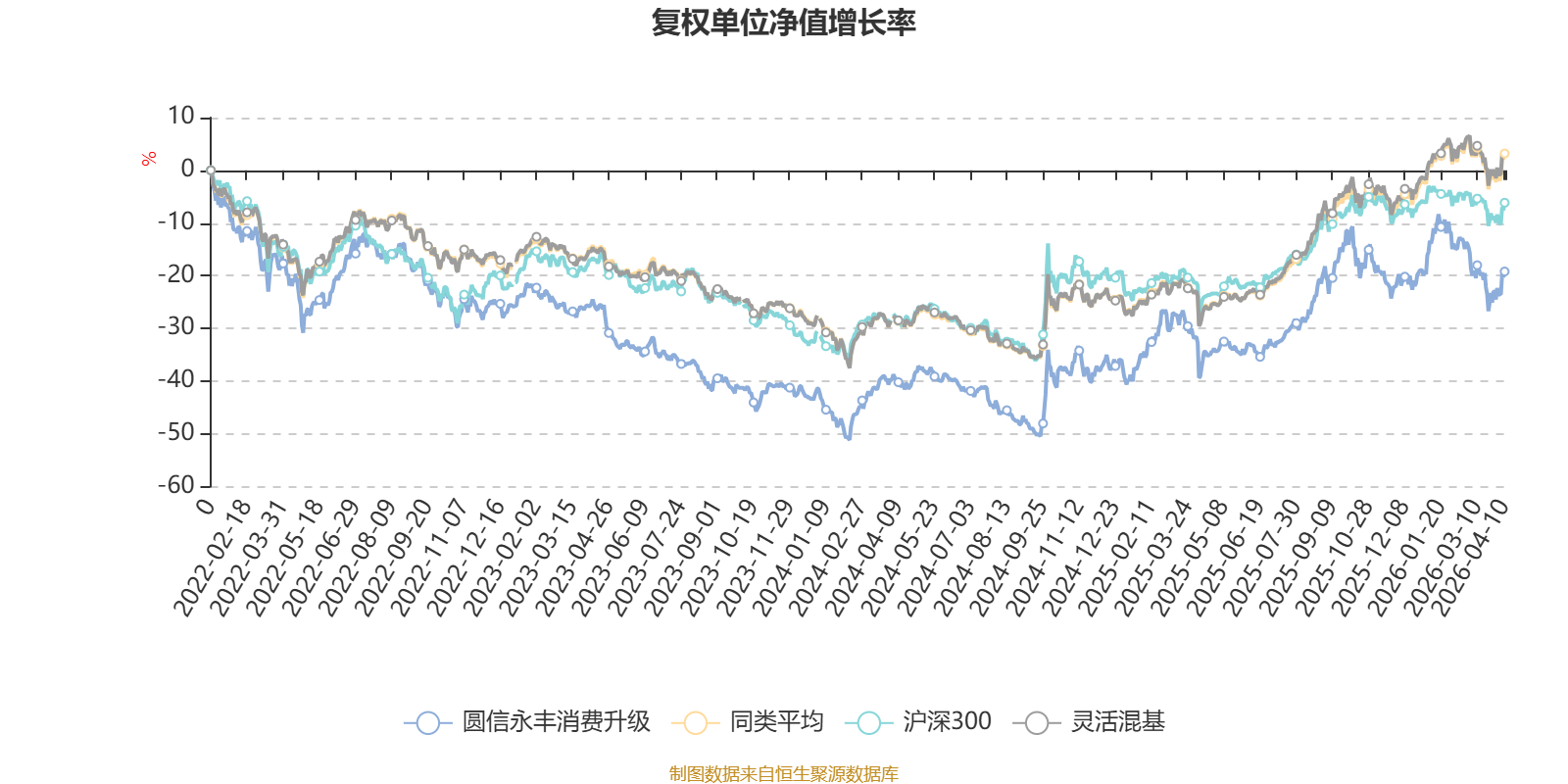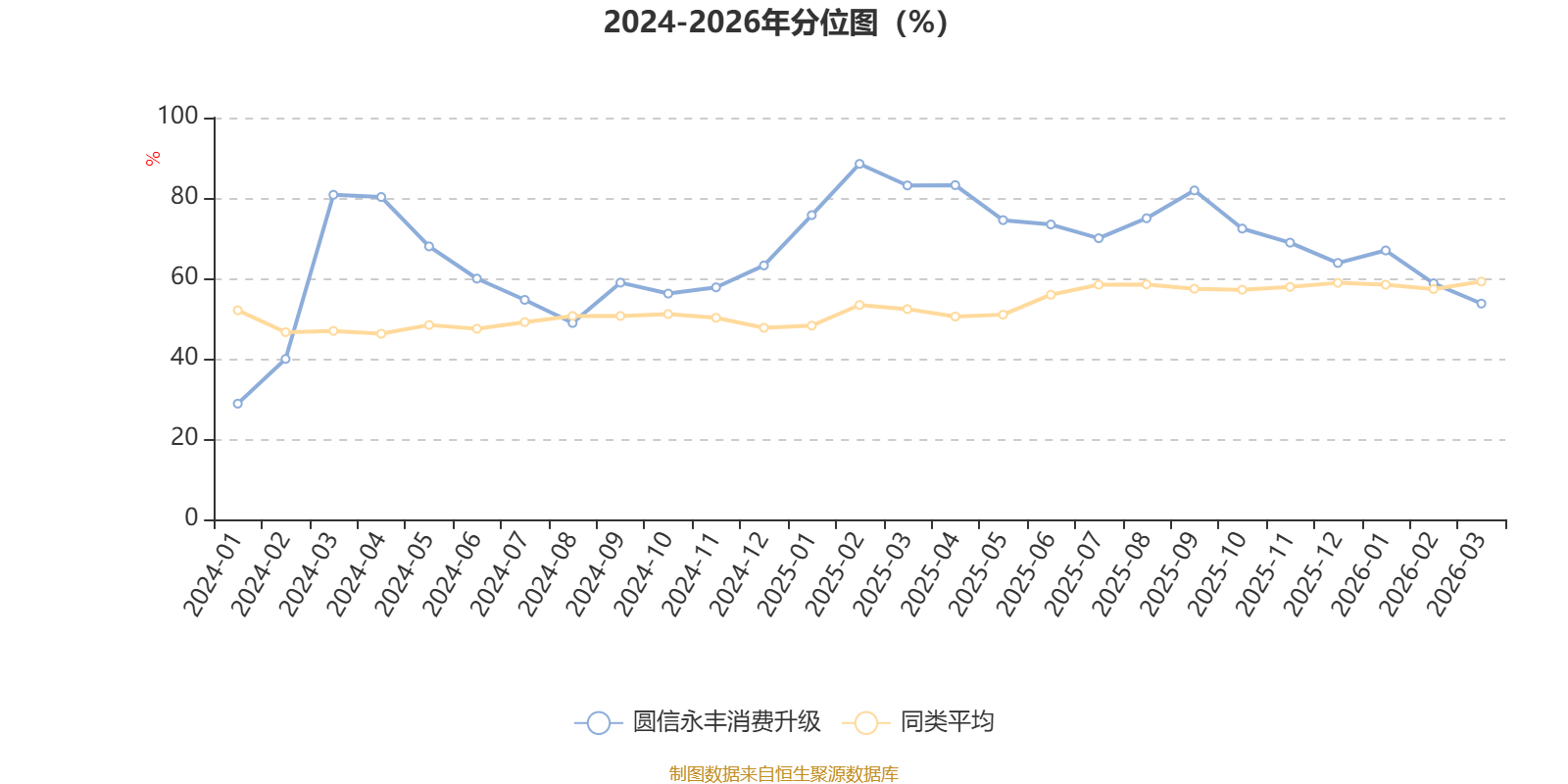 截至4月10日,圆信永丰消费升级近三个月复权单位净值增长率为-7.17%,位于同类可比基金1135/1287;近半年复权单位净值增长率为-5.52%,位于同类可比基金1137/1286;近一年复权单位净值增长率为26.47%,位于同类可比基金721/1286;近三年复权单位净值增长率为8.19%,位于同类可比基金808/1286。
