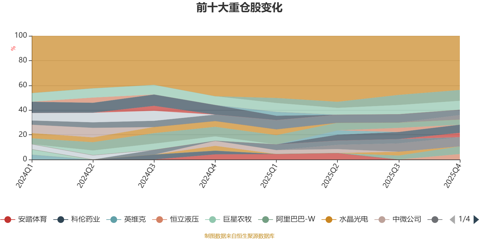 截至2025年末,基金十大重仓股分别是中芯国际、恺英网络、鼎龙股份、安集科技、阿里巴巴-W、恒立液压、腾讯控股、古井贡酒、乐鑫科技、泰格医药。