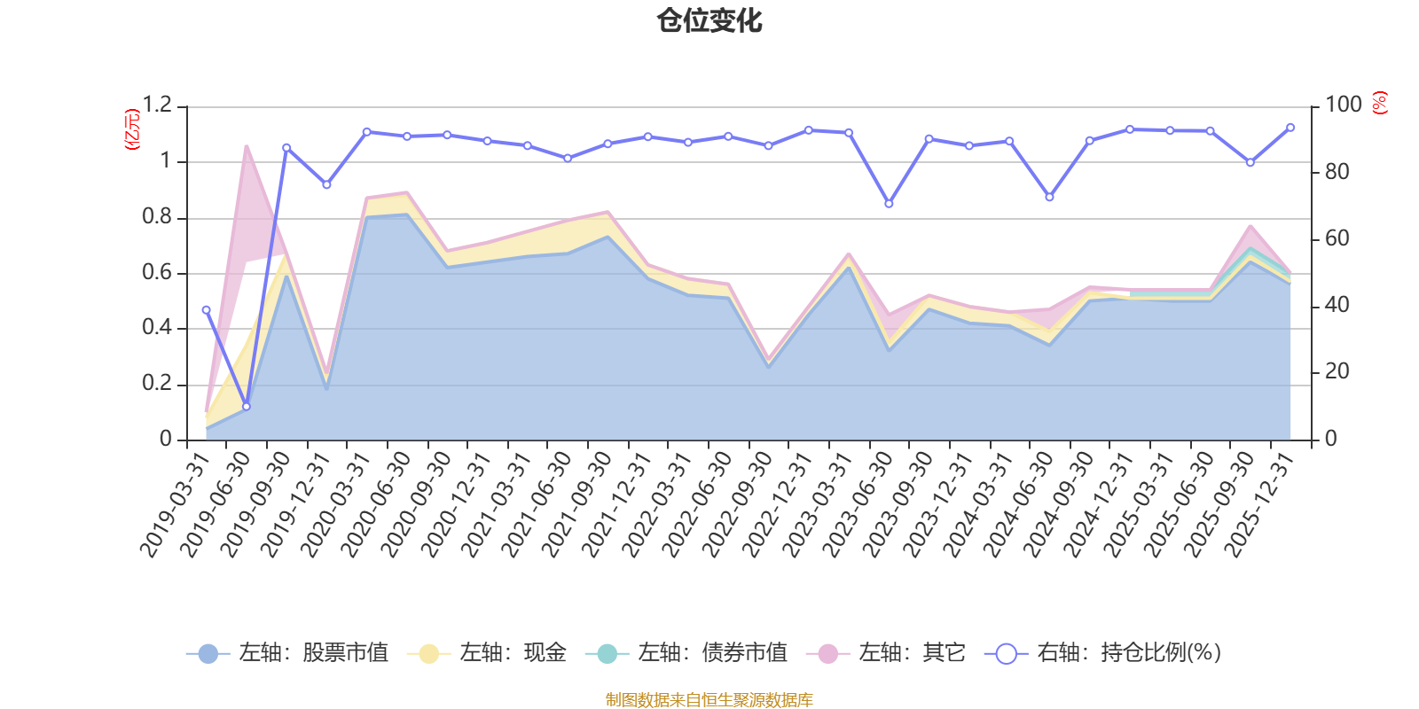 据定期报告数据统计,近三年平均股票仓位为87.41%,同类平均为72.57%。2025年末基金达到93.67%的最高仓位,2019年上半年末最低,为10.04%。
