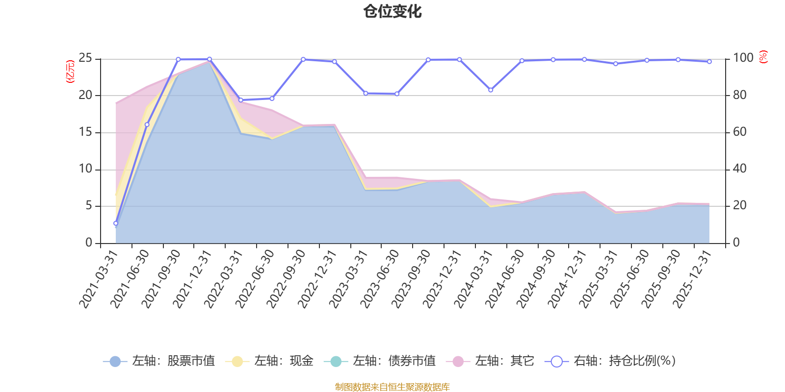 据定期报告数据统计,近三年平均股票仓位为94.77%,同类平均为85.83%。2021年末基金达到99.82%的最高仓位,2021年一季度末最低,为10.84%。