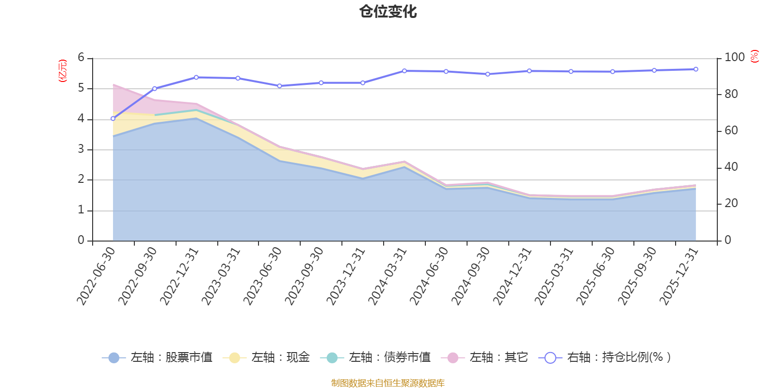 据定期报告数据统计,近三年平均股票仓位为90.82%,同类平均为86.41%。2025年末基金达到93.99%的最高仓位,2022年上半年末最低,为66.96%。