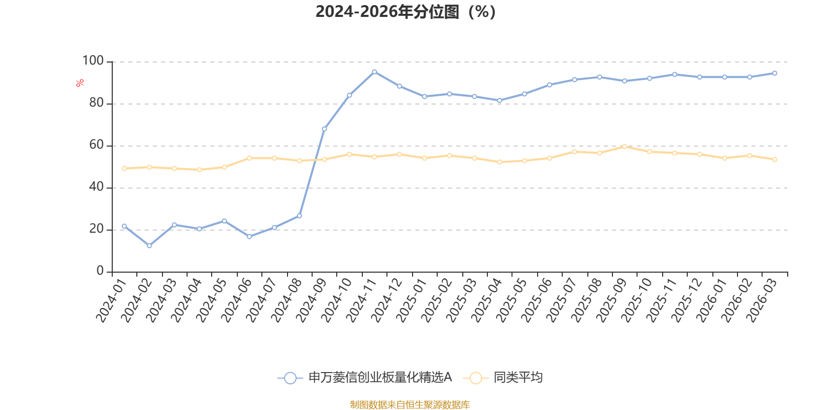 通过所选区间该基金净值增长率分位图,可以观察该基金与同类基金业绩比较情况。图为坐标原点到区间内某时点的净值增长率在同类基金中的分位数。