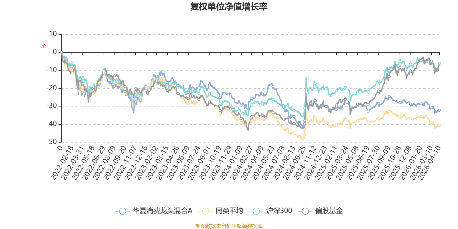 截至4月10日,华夏消费龙头混合A近三个月复权单位净值增长率为-5.13%,位于同类可比基金16/85;近半年复权单位净值增长率为-6.99%,位于同类可比基金20/85;近一年复权单位净值增长率为-1.92%,位于同类可比基金36/85;近三年复权单位净值增长率为-19.87%,位于同类可比基金31/76。