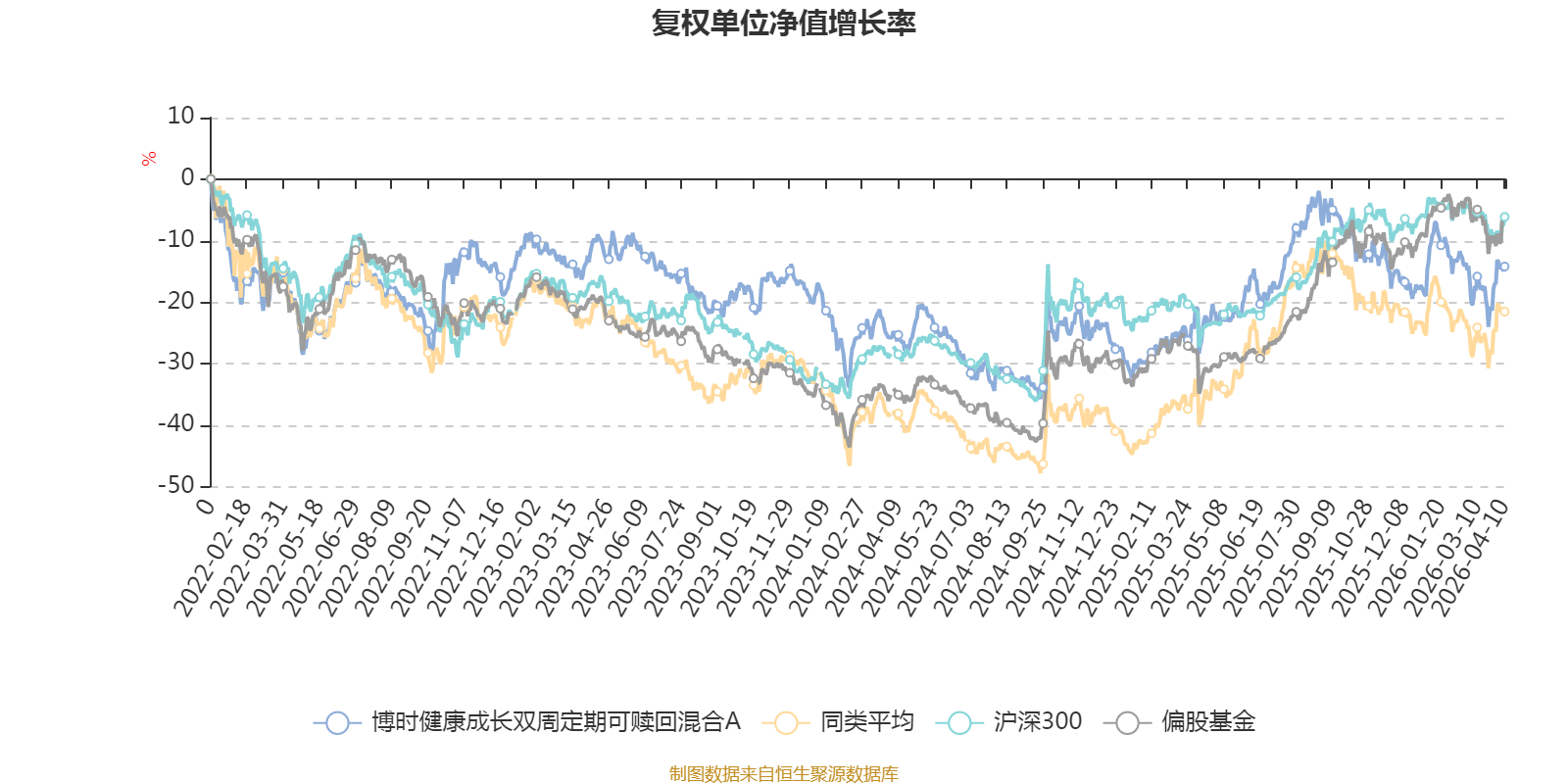 截至4月10日,博时健康成长双周定期可赎回混合A近三个月复权单位净值增长率为-5.55%,位于同类可比基金53/106;近半年复权单位净值增长率为-5.23%,位于同类可比基金43/106;近一年复权单位净值增长率为13.15%,位于同类可比基金82/104;近三年复权单位净值增长率为-4.95%,位于同类可比基金45/78。