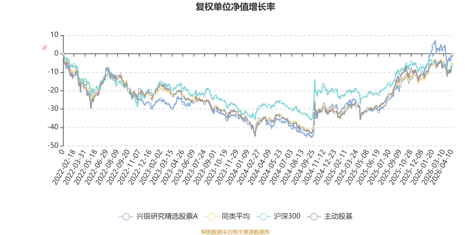 截至4月10日,兴银研究精选股票A近三个月复权单位净值增长率为0.50%,位于同类可比基金61/121;近半年复权单位净值增长率为13.28%,位于同类可比基金23/121;近一年复权单位净值增长率为48.71%,位于同类可比基金43/120;近三年复权单位净值增长率为31.99%,位于同类可比基金26/90。
