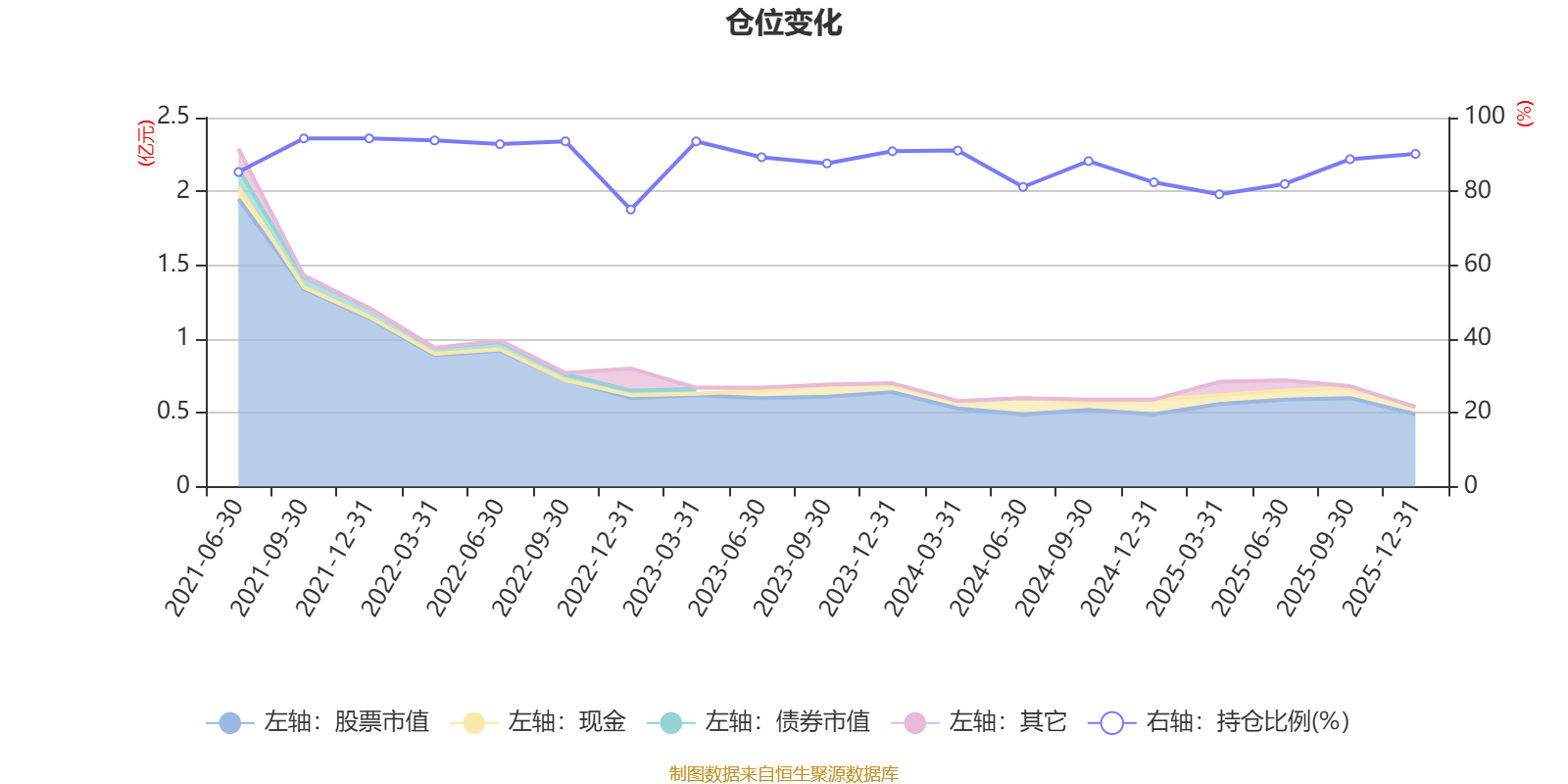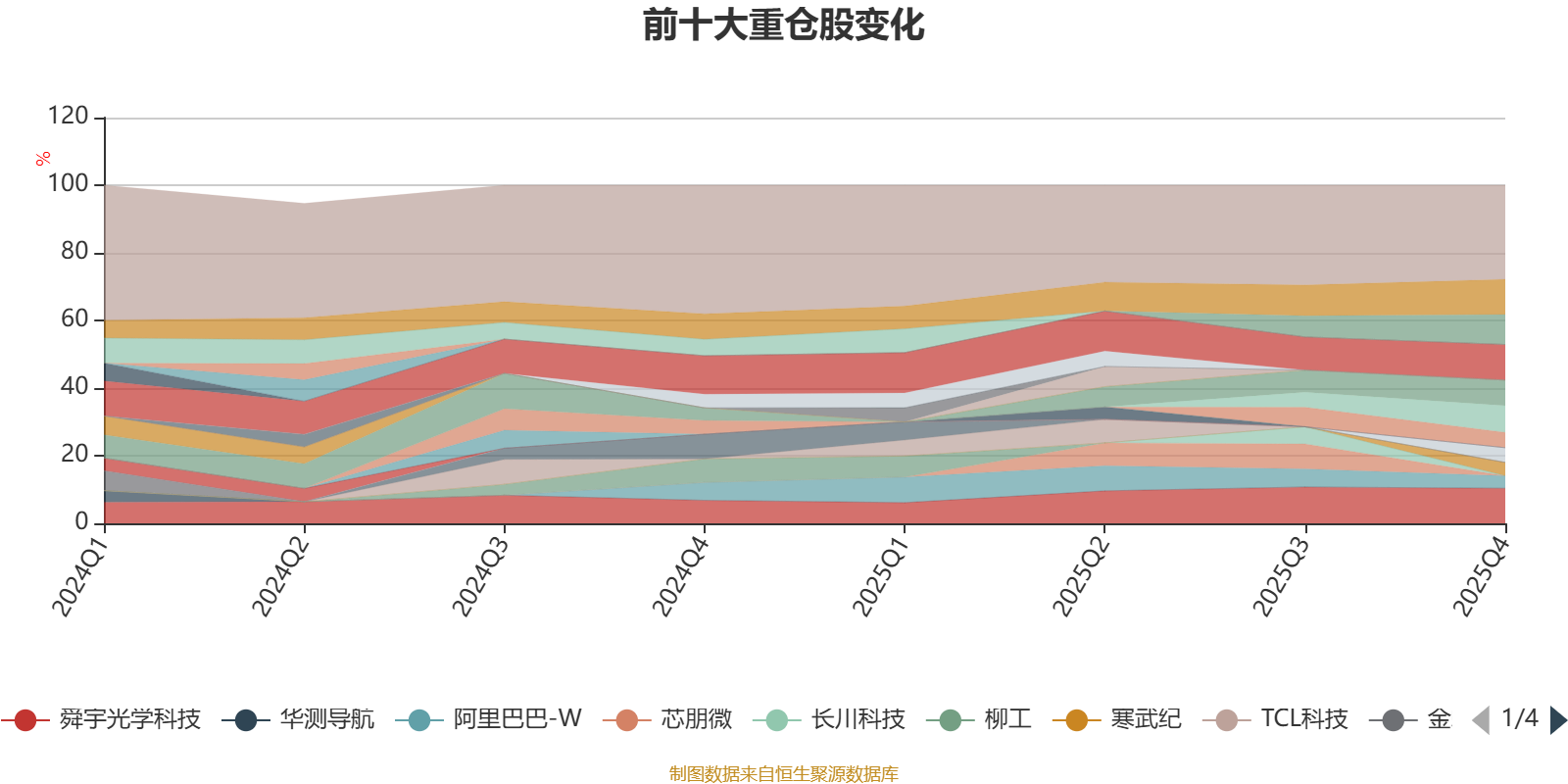 该基金持股集中度较高,近2年前十大重仓股集中度长期超过60%。截至2025年末,基金十大重仓股分别是京东方A、舜宇光学科技、中国铁塔、大金重工、哔哩哔哩-W、中望软件、安集科技、海大集团、寒武纪、阿里巴巴-W。