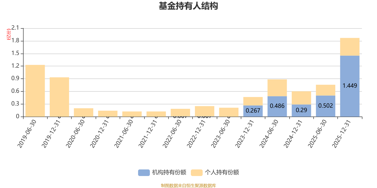 截至2025年12月31日,基金持有人共计1.43万户,合计持有1.87亿份。其中管理人员工持有7.05万份,占比0.04%,机构持有份额占比77.54%,个人投资者占比22.46%。