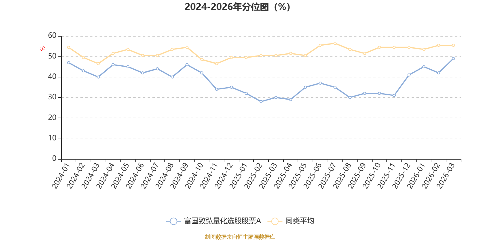 通过所选区间该基金净值增长率分位图,可以观察该基金与同类基金业绩比较情况。图为坐标原点到区间内某时点的净值增长率在同类基金中的分位数。