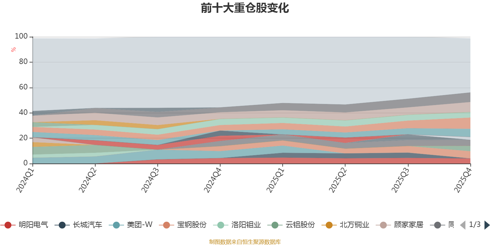 截至2025年末,基金十大重仓股分别是天山铝业、中国铝业、赤峰黄金、西部矿业、宝钢股份、同程旅行、特步国际、云铝股份、明阳电气、赣锋锂业。