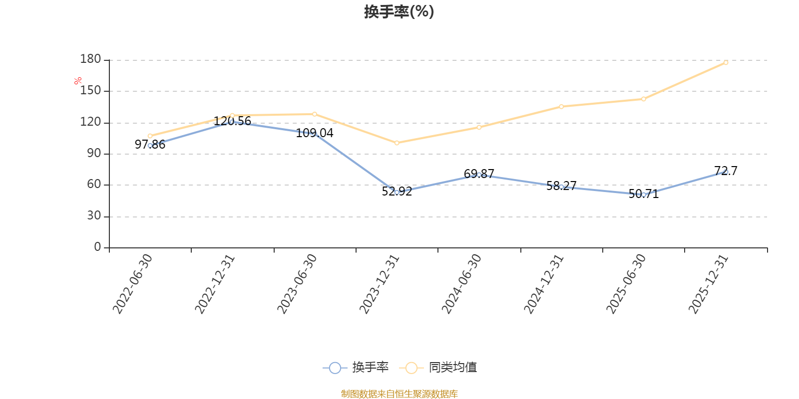 截至2025年12月31日,基金最近一年换手率约123.03%,持续低于同类均值。
