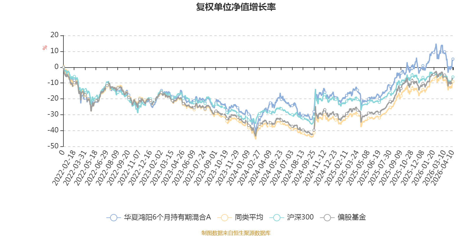 截至4月10日,华夏鸿阳6个月持有期混合A近三个月复权单位净值增长率为-2.90%,位于同类可比基金126/185;近半年复权单位净值增长率为4.41%,位于同类可比基金75/185;近一年复权单位净值增长率为35.67%,位于同类可比基金94/185;近三年复权单位净值增长率为28.46%,位于同类可比基金54/177。