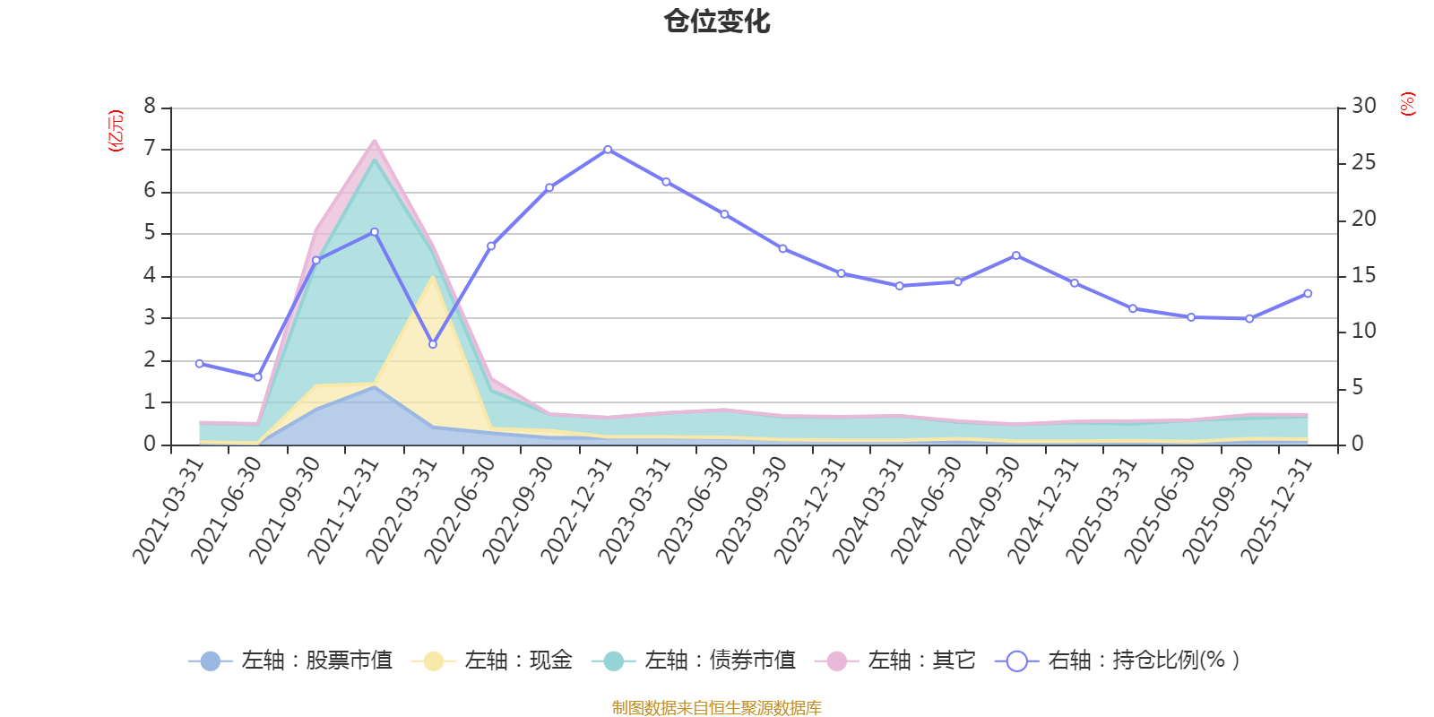 据定期报告数据统计,近三年平均股票仓位为15.39%,同类平均为19.2%。2022年末基金达到26.27%的最高仓位,2021年上半年末最低,为6.04%。