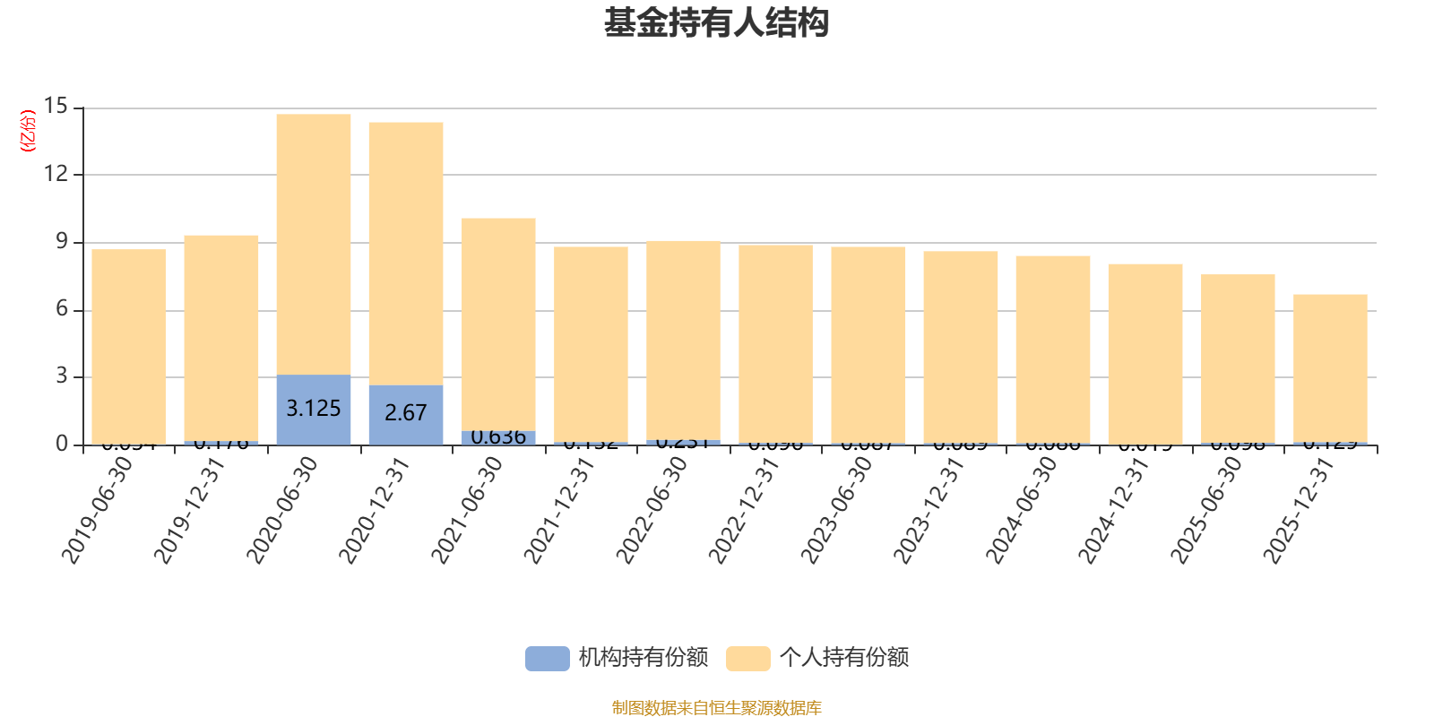 截至2025年12月31日,基金持有人共计20.33万户,合计持有6.69亿份。其中管理人员工持有27.92万份,占比0.04%,机构持有份额占比1.92%,个人投资者占比98.08%。