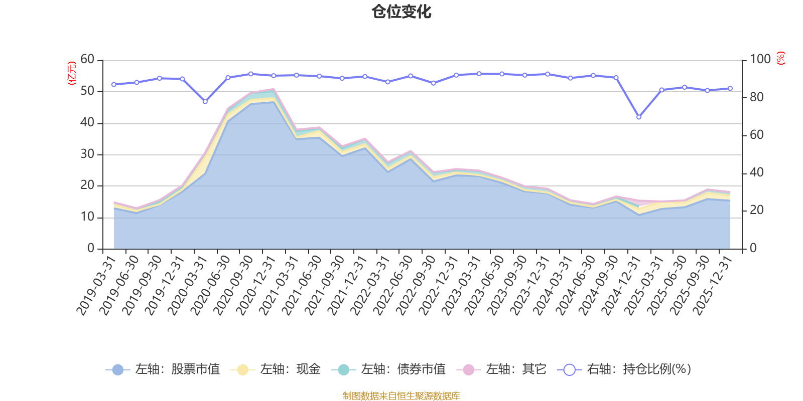 据定期报告数据统计,近三年平均股票仓位为87.67%,同类平均为87.64%。2023年一季度末基金达到92.8%的最高仓位,2024年末最低,为69.86%。