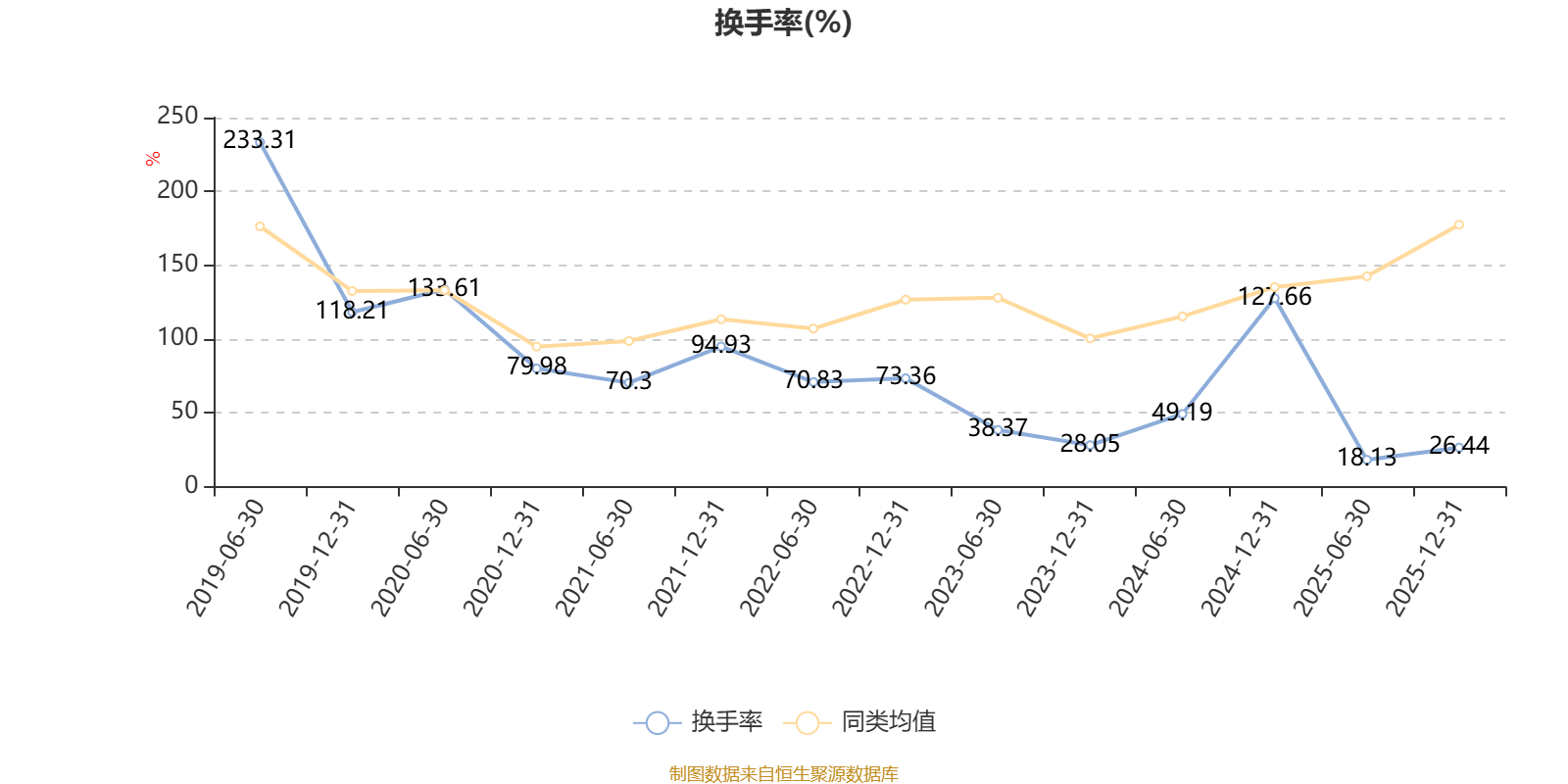 截至2025年12月31日,基金最近一年换手率约45.17%,持续5年低于同类均值。