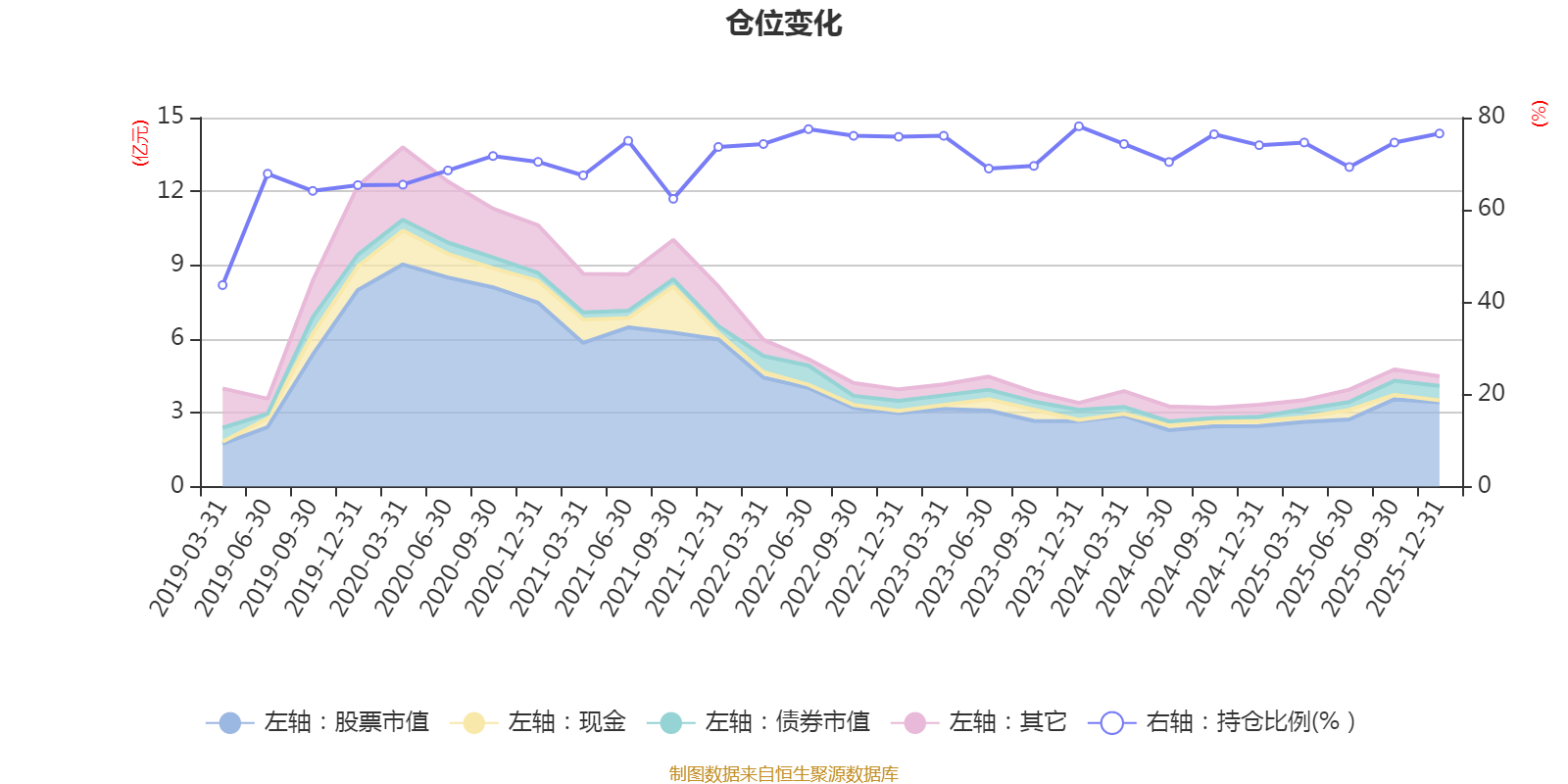 据定期报告数据统计,近三年平均股票仓位为73.56%,同类平均为72.57%。2023年末基金达到78.12%的最高仓位,2019年一季度末最低,为43.68%。