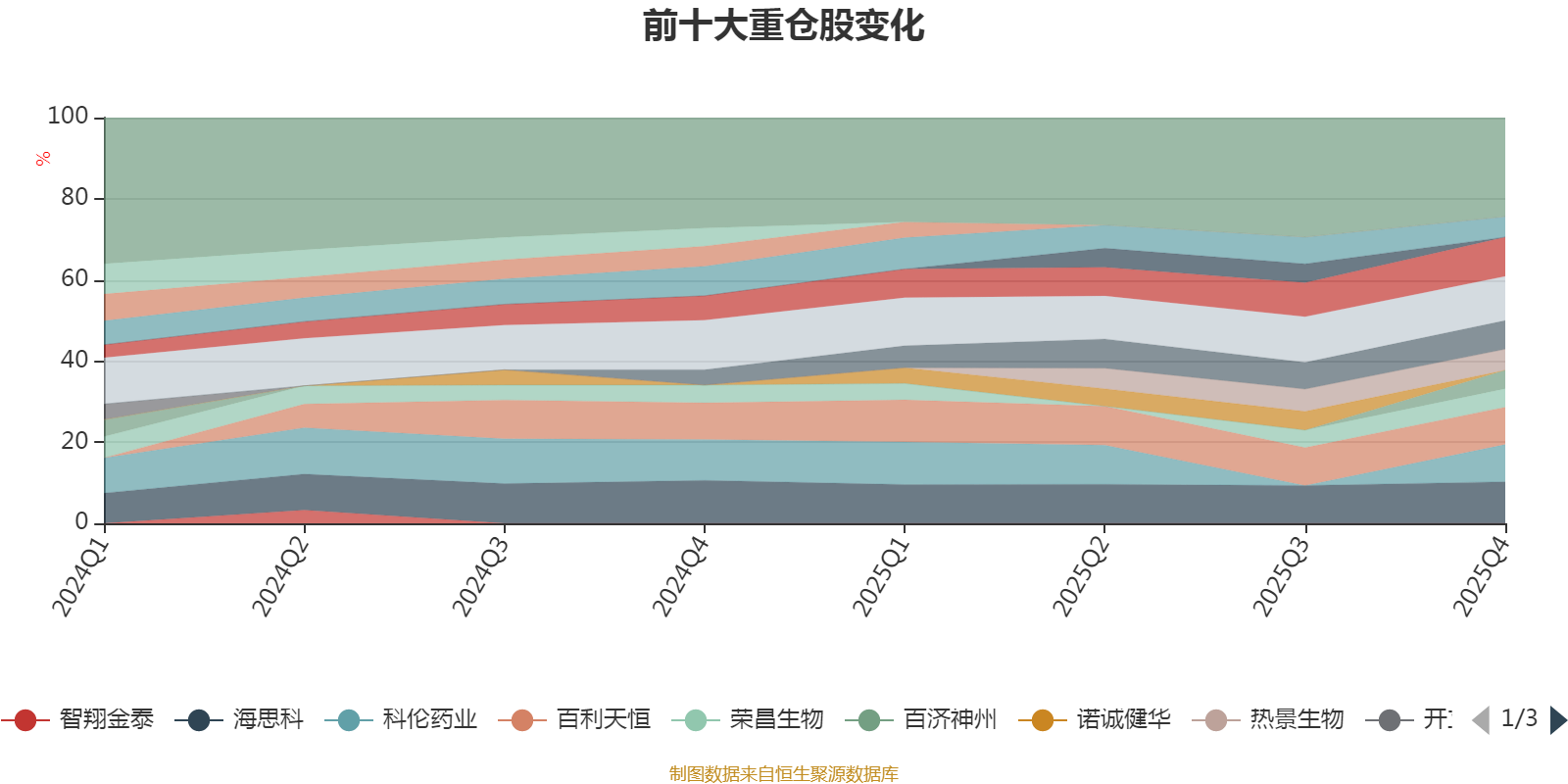 该基金持股集中度较高,近2年前十大重仓股集中度长期超过60%。截至2025年末,基金十大重仓股分别是恒瑞医药、海思科、泽璟制药、百利天恒、科伦药业、新诺威、热景生物、信立泰、百济神州、荣昌生物。
