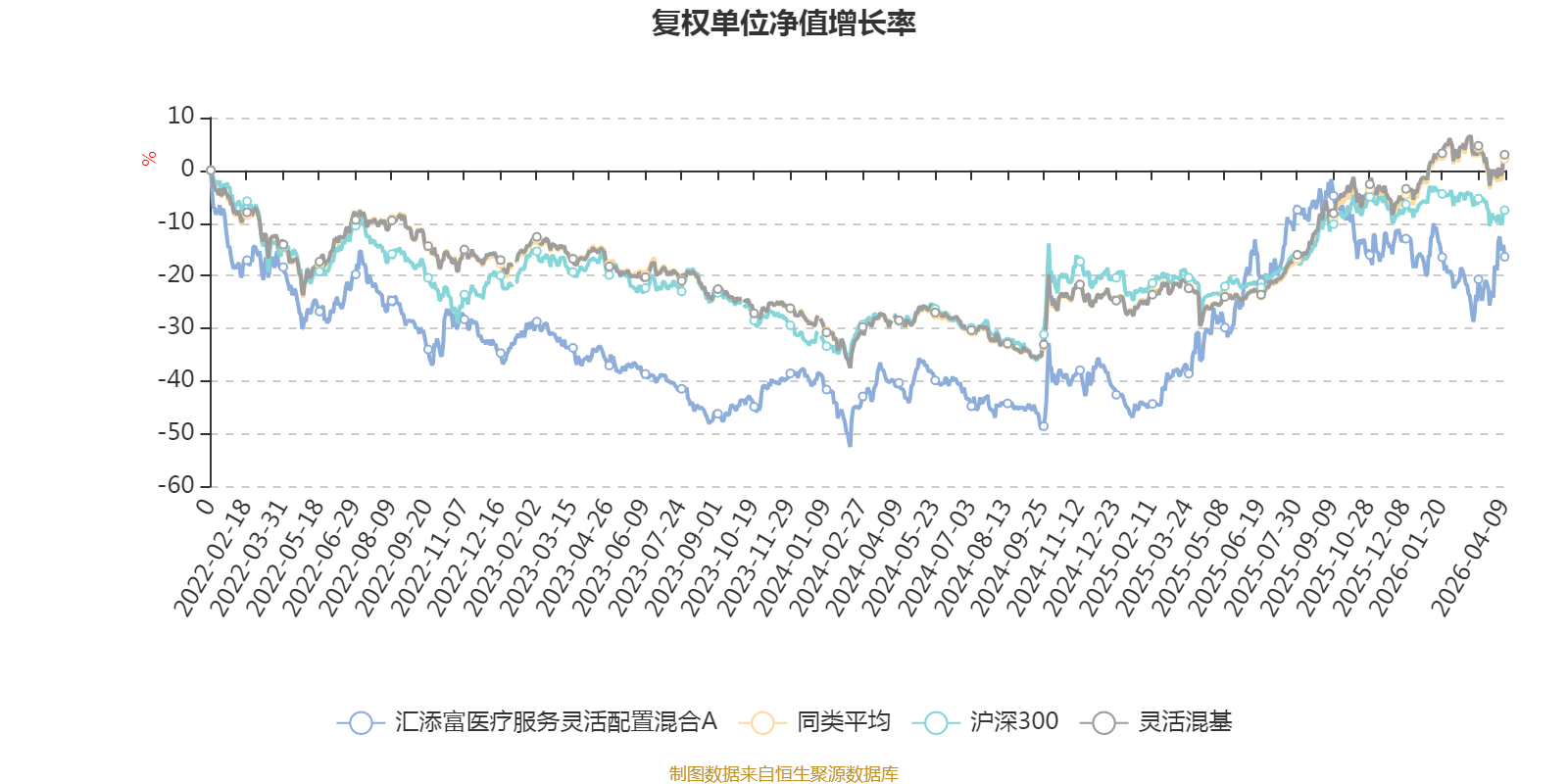 截至4月9日,汇添富医疗服务灵活配置混合A近三个月复权单位净值增长率为-7.05%,位于同类可比基金1101/1287;近半年复权单位净值增长率为-6.17%,位于同类可比基金1086/1286;近一年复权单位净值增长率为30.14%,位于同类可比基金655/1286;近三年复权单位净值增长率为26.35%,位于同类可比基金392/1286。