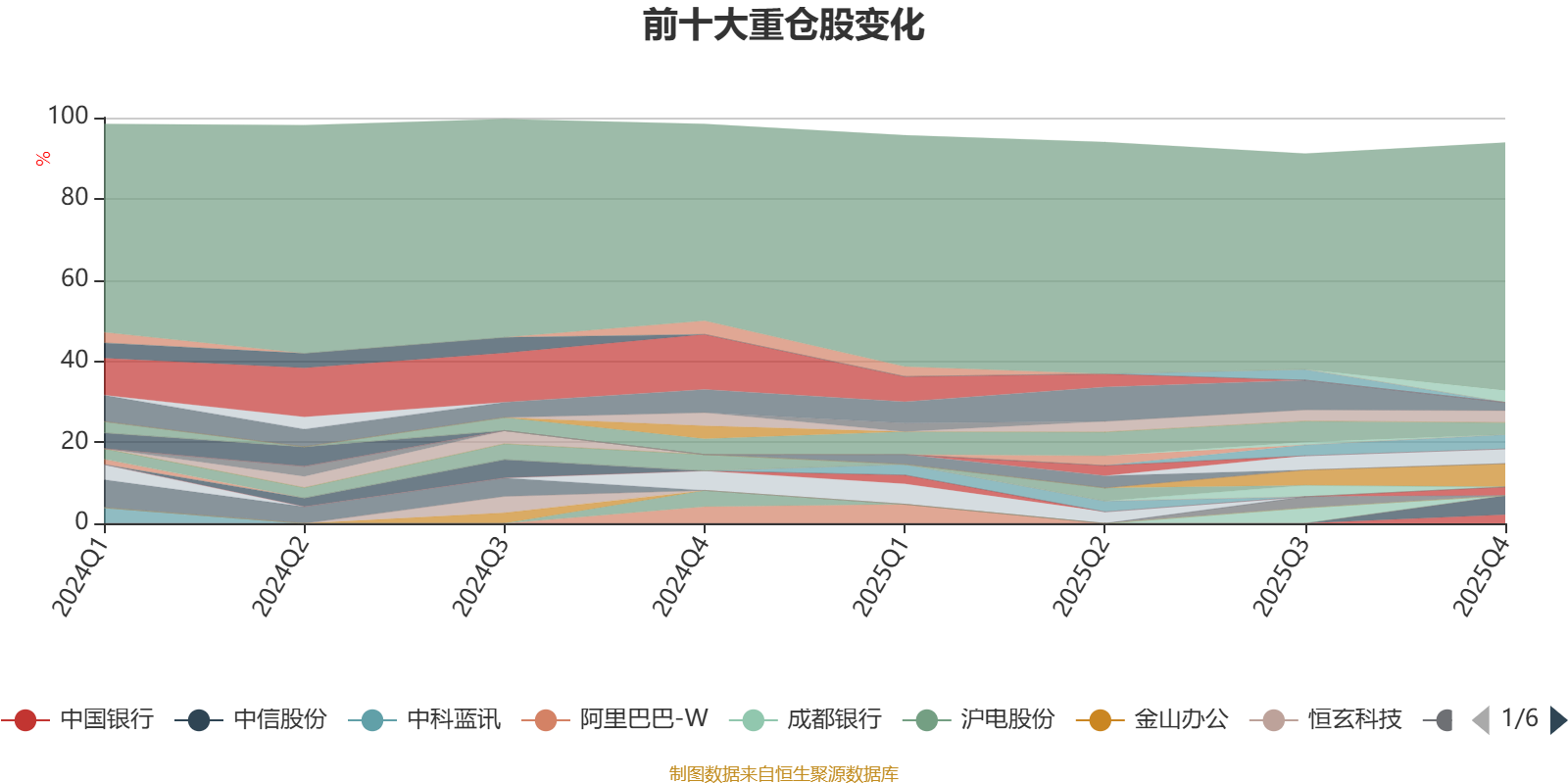 截至2025年末,基金十大重仓股分别是中国平安、中信股份、渝农商行、中国电信、美的集团、腾讯控股、百胜中国、中国银行、工商银行、中国移动。