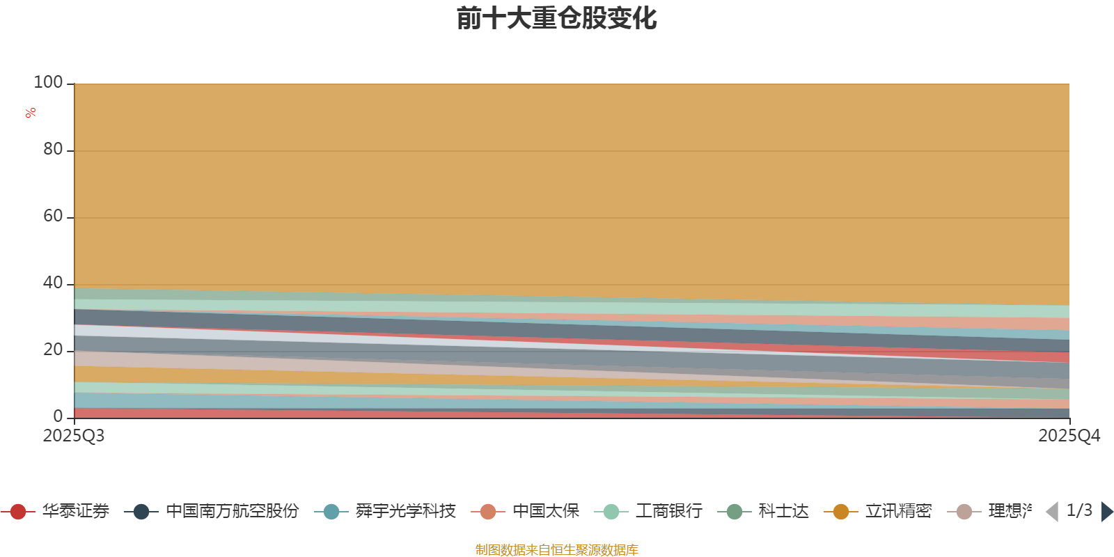 截至2025年末,基金十大重仓股分别是阿里巴巴-W、恒瑞医药、TCL电子、乐普医疗、科士达、思源电气、杰瑞股份、中微公司、中国太保、中国南方航空股份。