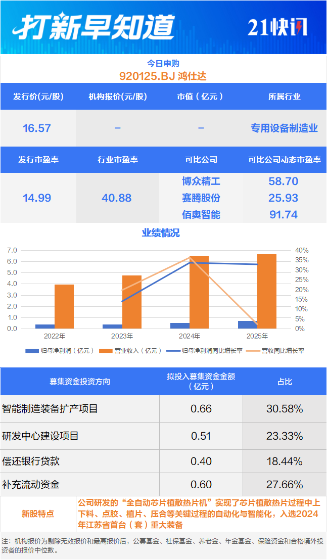 4月13日,可申购北交所的鸿仕达(920125.BJ);另有一只新股上市,为北交所的创达新材(920012.BJ)。