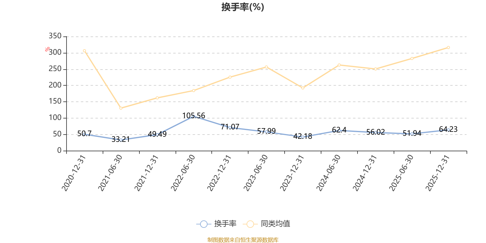截至2025年12月31日,基金最近一年换手率约115.02%,持续低于同类均值。