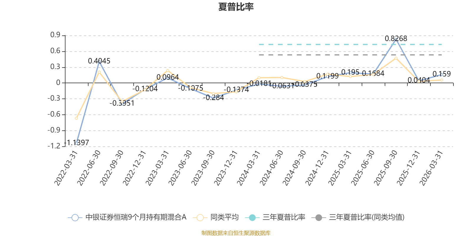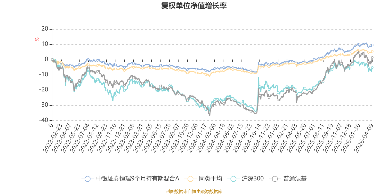 截至4月9日,中银证券恒瑞9个月持有期混合A近三个月复权单位净值增长率为0.77%,位于同类可比基金182/629;近半年复权单位净值增长率为2.30%,位于同类可比基金163/629;近一年复权单位净值增长率为12.71%,位于同类可比基金106/629;近三年复权单位净值增长率为13.03%,位于同类可比基金209/581。