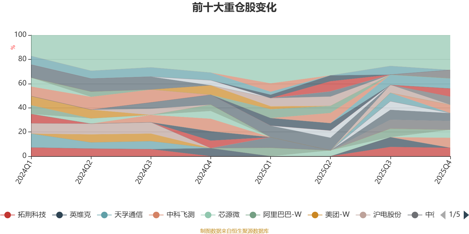 该基金持股集中度较高,近2年前十大重仓股集中度长期超过60%。截至2025年末,基金十大重仓股分别是华虹半导体、中科飞测、中微公司、拓荆科技、北方华创、寒武纪、珂玛科技、安集科技、芯源微、中芯国际。