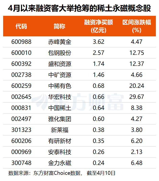4月至今,超九成稀土永磁概念股实现股价上涨,华宏科技大涨29.67%居首,中稀有色亦涨逾两成,包钢股份、盛和资源、英思特涨幅均在10%以上。